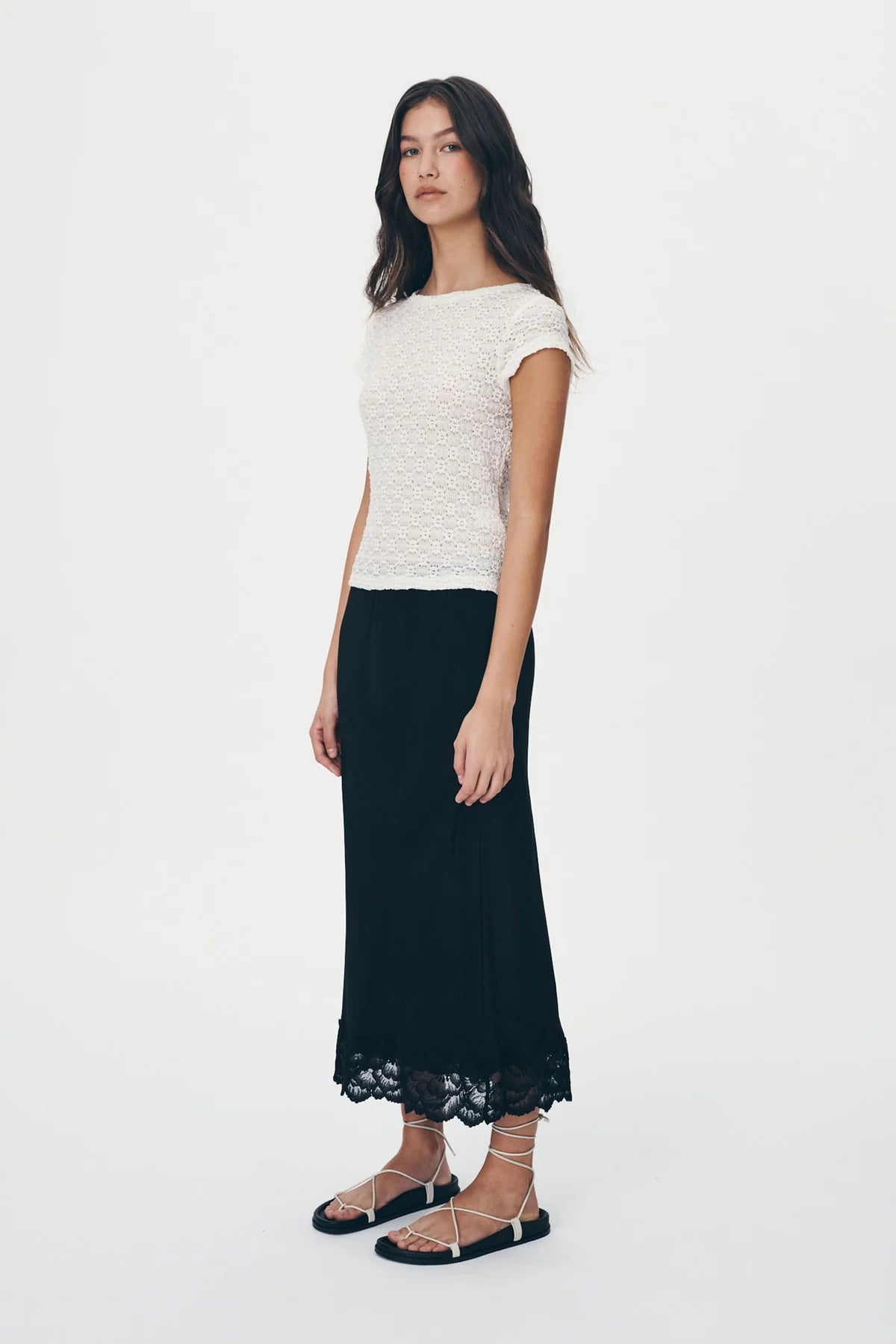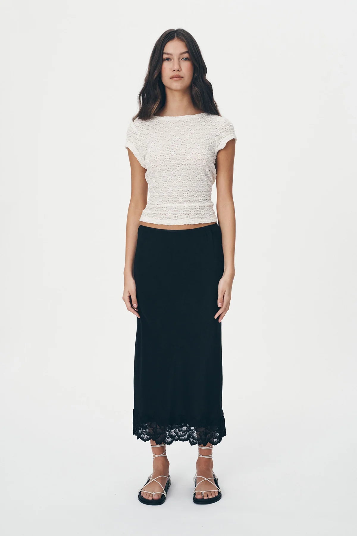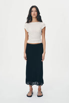 The Marina Silk Midi Skirt is an elegant take on our best-selling Marina Mini. Crafted from a blend of silk crepe and nylon lace, this high-waisted, lined, bias-cut skirt heros a delicate lace hem. Destined to to become a key player in your wardrobe, style with the Loretta Knit Top, or Galo Lace Daisy Tee to take this skirt from day to night.