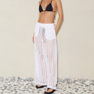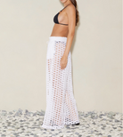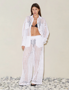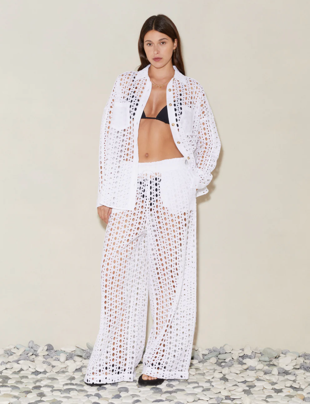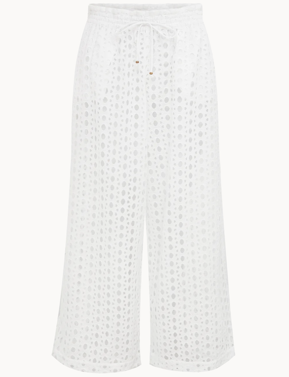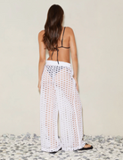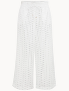 Subtle wide leg, full length pant in custom Boteh evil eye broderie. Featuring soft elastic waist, mock waist tie and functional front pockets. Please view last image for accurate fabric.