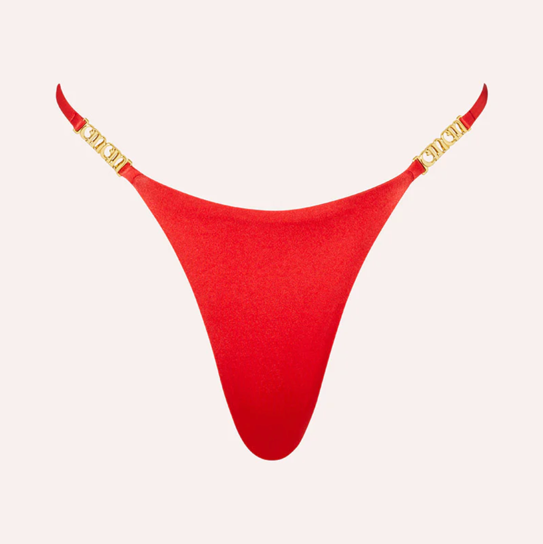 With a high-cut leg and custom Cin Cin hardware, the Midsummer bottoms are an elevated string bikini bottom.