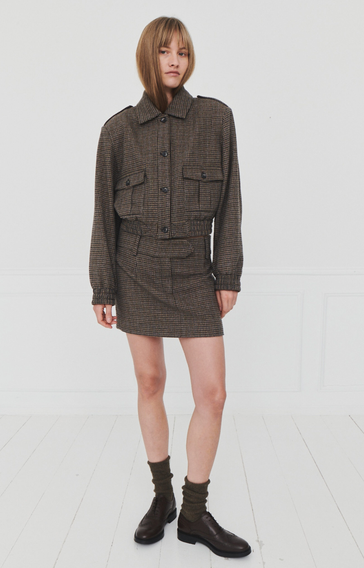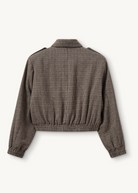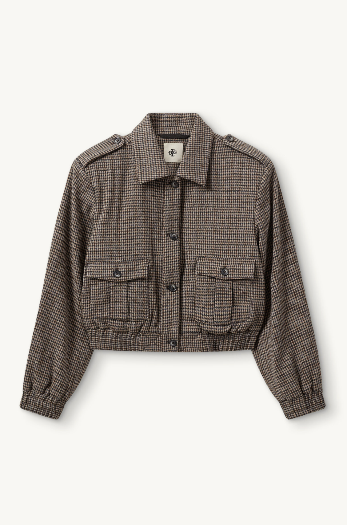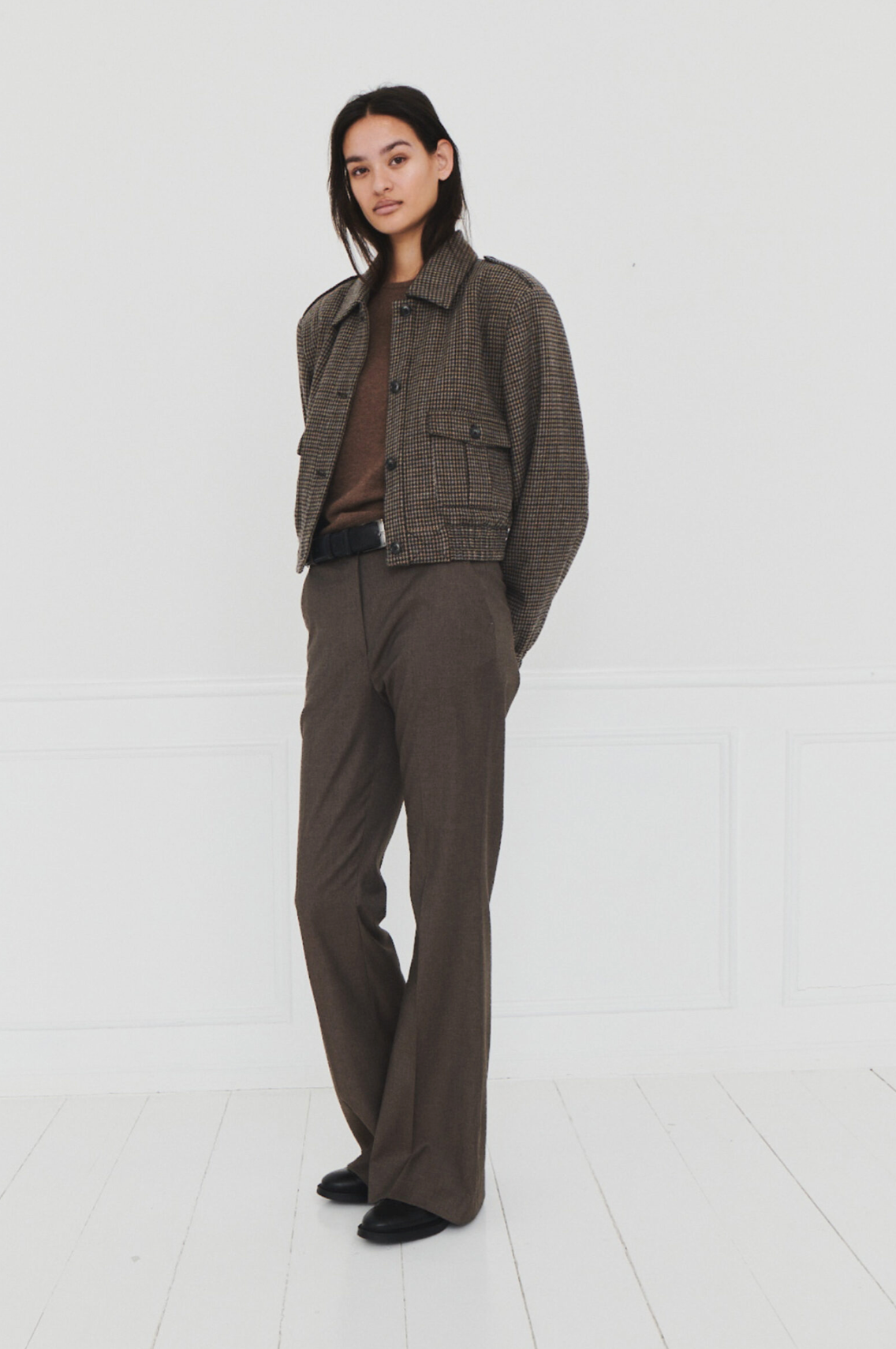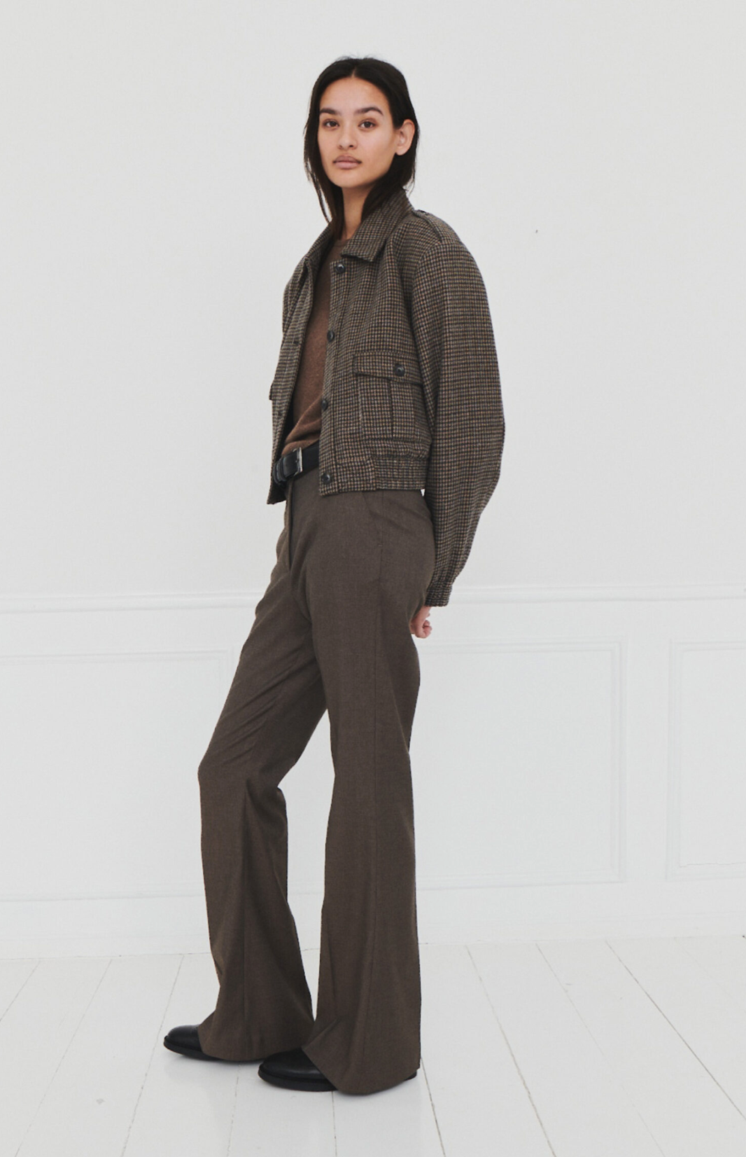 The Sion Bomber is a short bomber jacket crafted from 60% recycled wool. Its sustainable material and sleek design make it a stylish and eco-friendly choice for a modern, casual look.