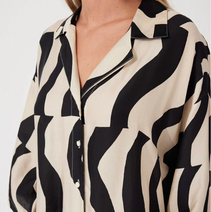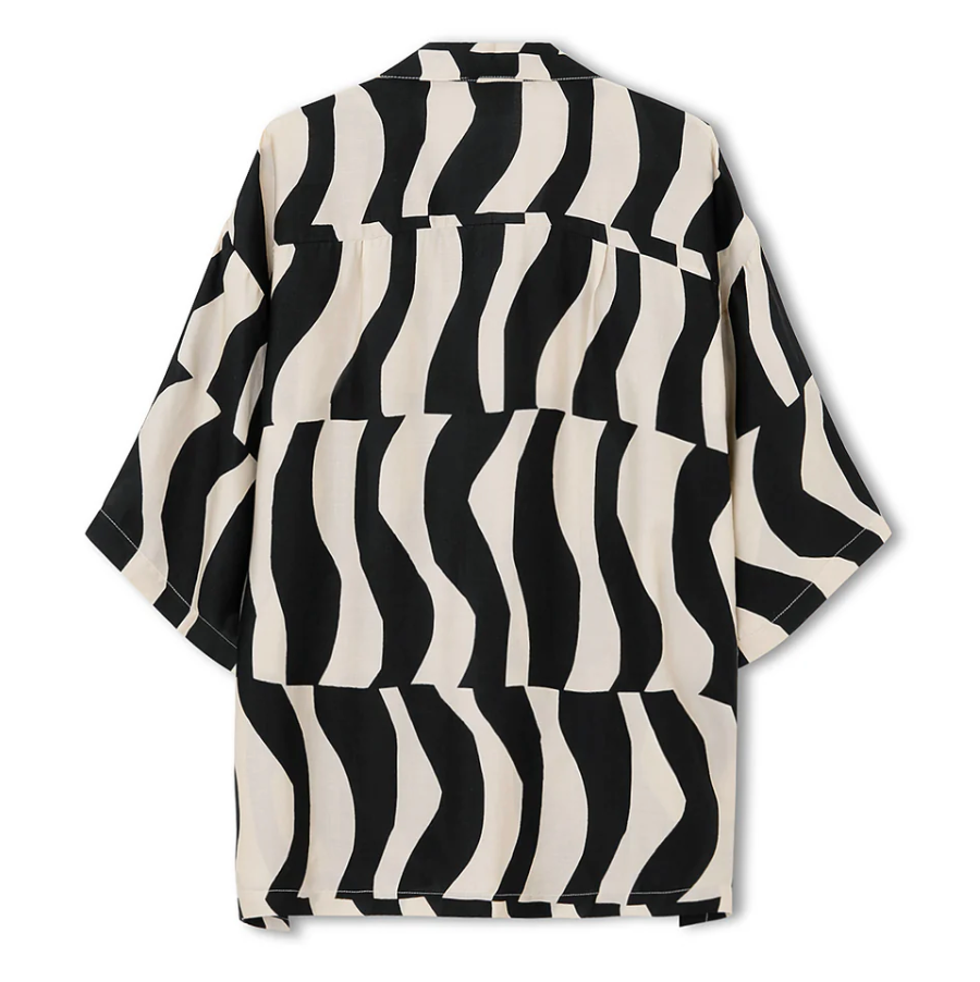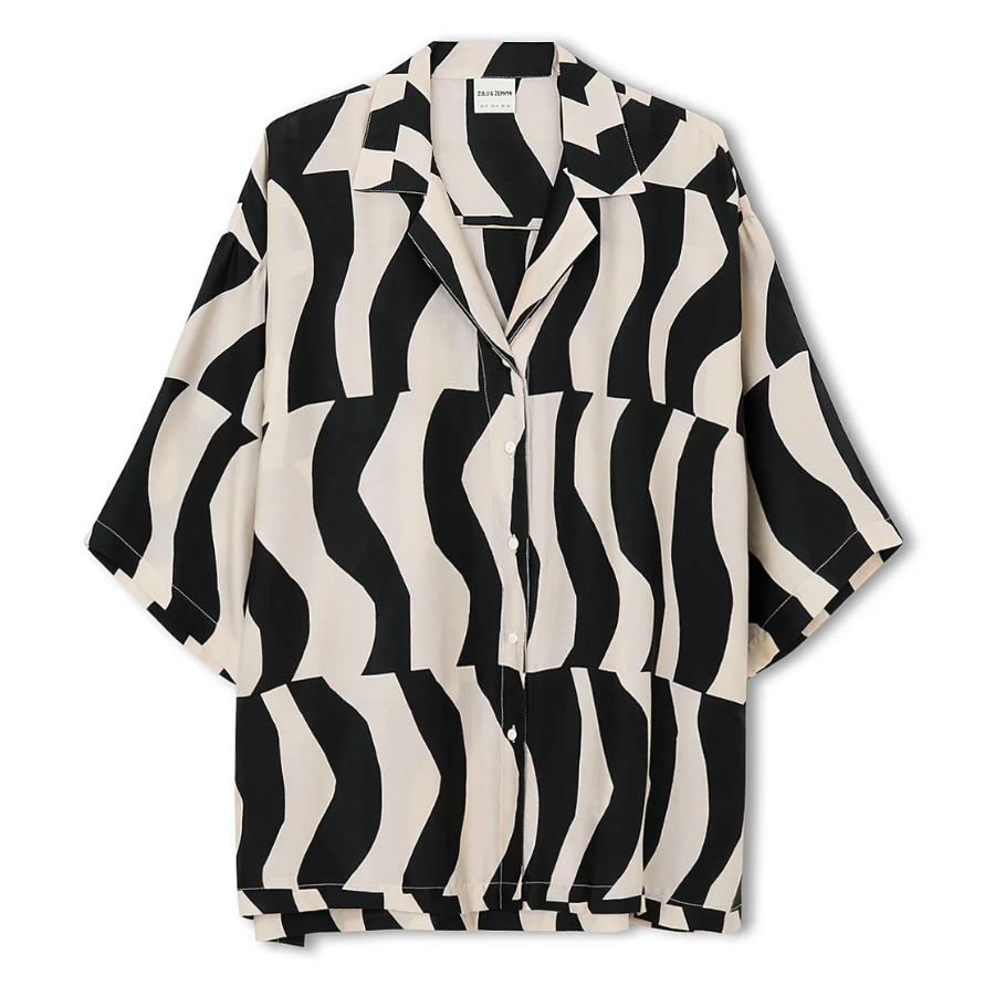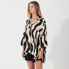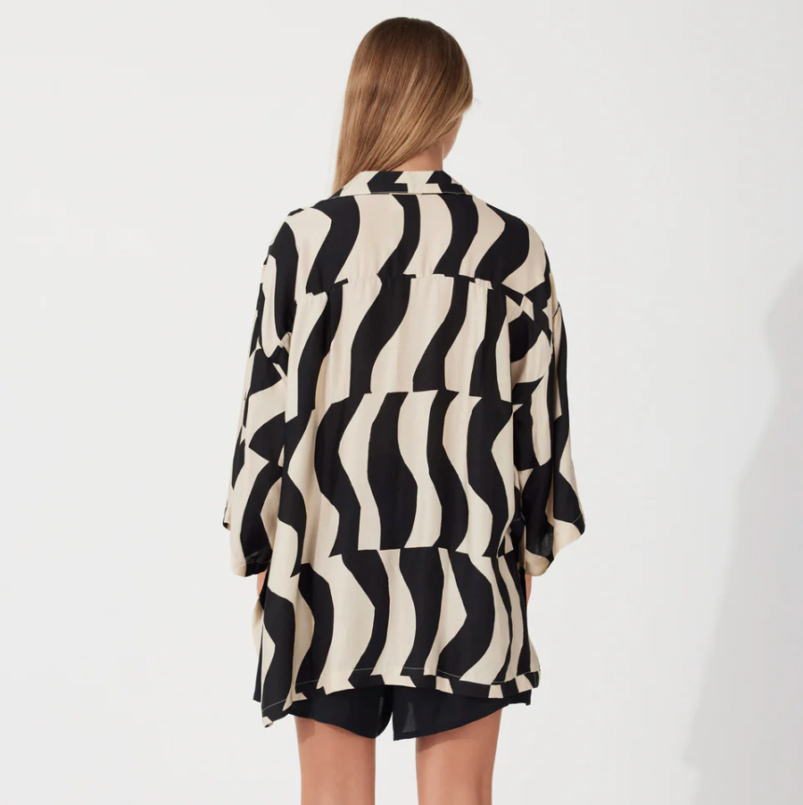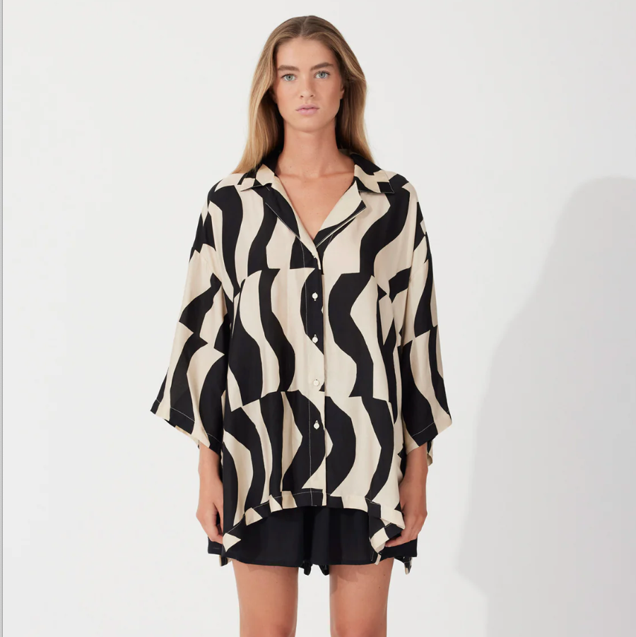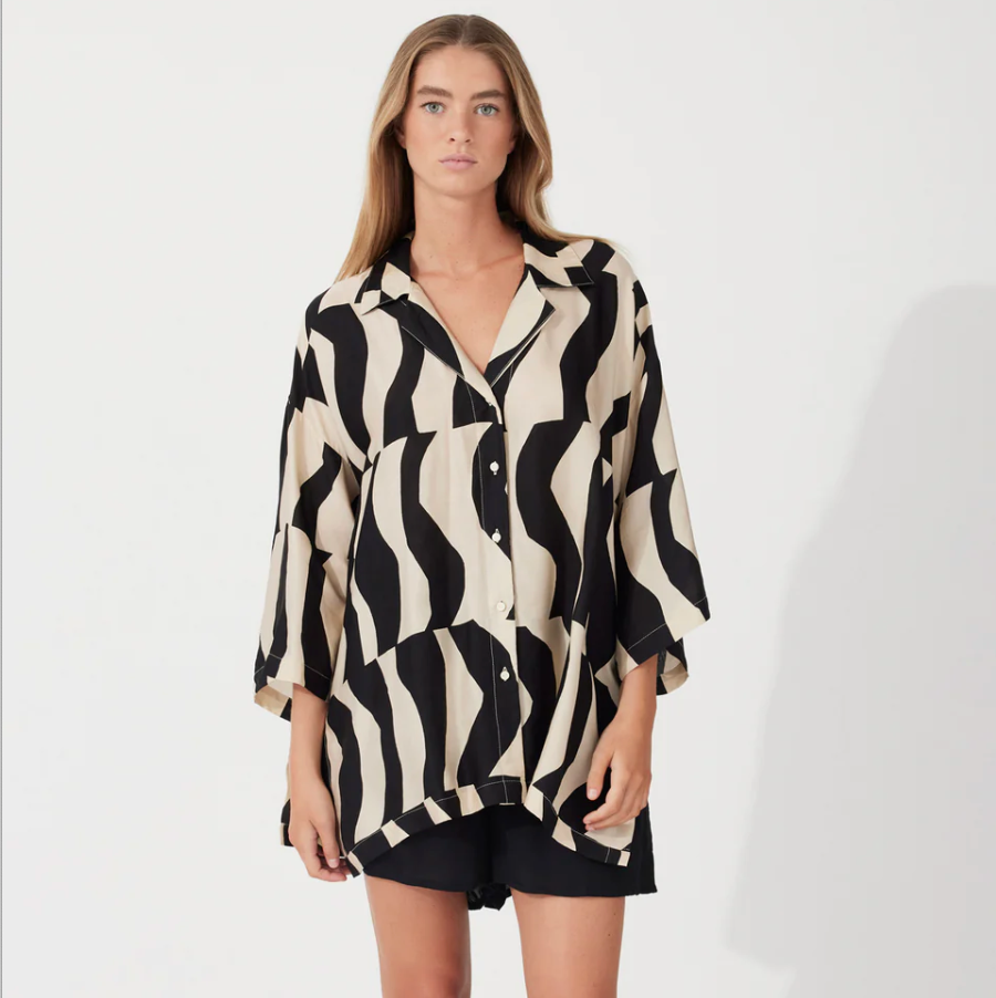 The Splice Lenzing Tencel Shirt by Zulu & Zephyr is a relaxed fit shirt with button down front and wide loose sleeve, featuring a spliced custom screen print. Pair this with the Black Lenzing Tencel Short and the essential Zulu & Zephyr Thong - Black for the complete outfit.