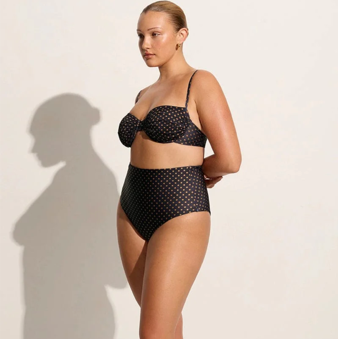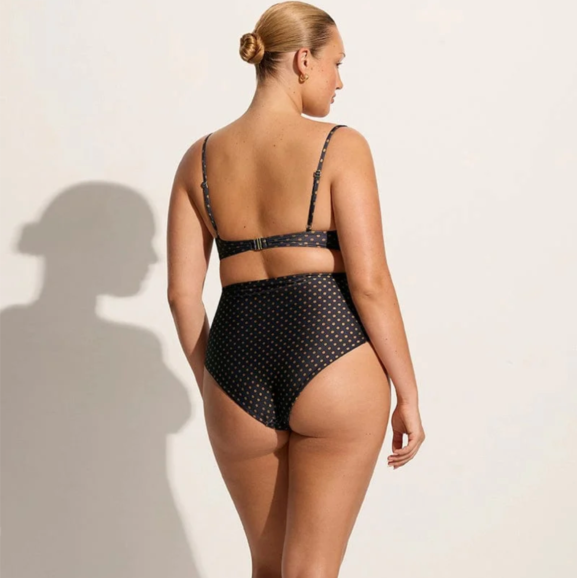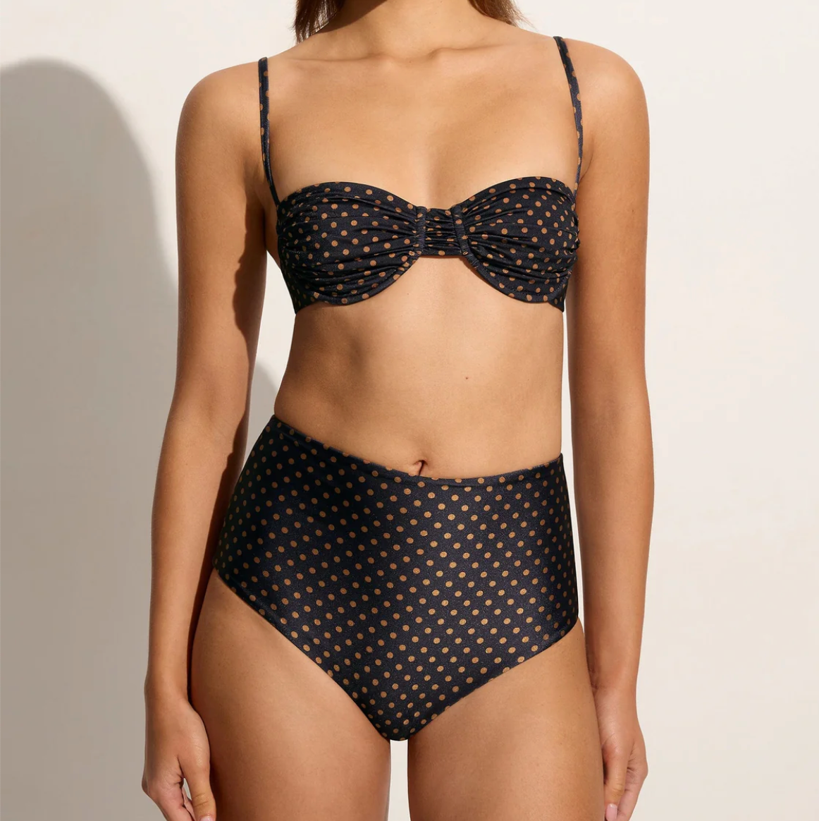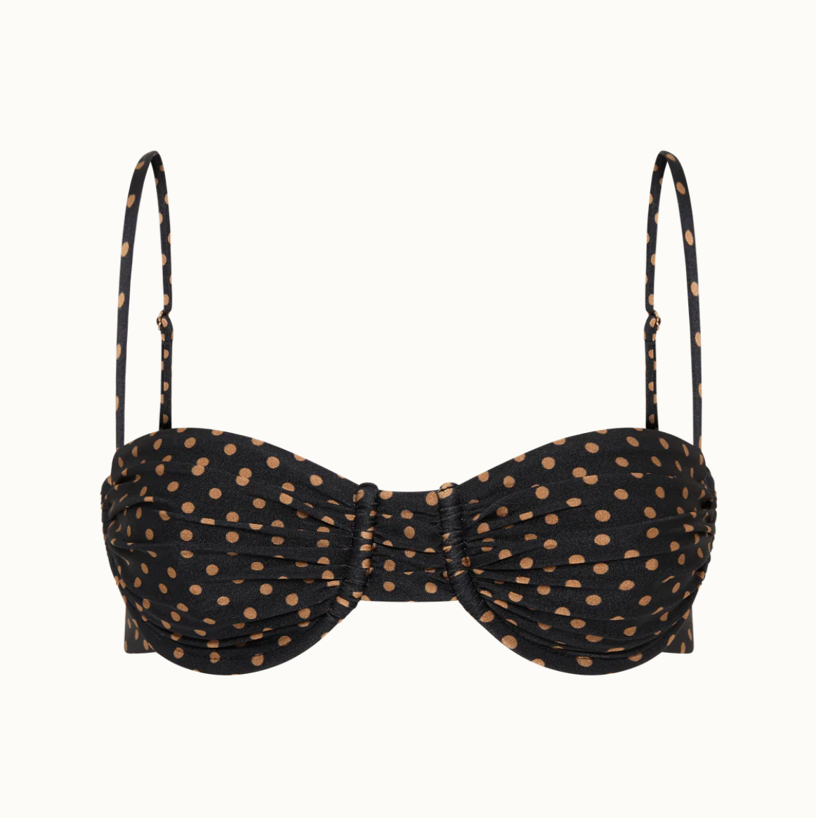 The Stefania Bikini Top in Ludovica Polka Dot is a balconette-style top featuring intricately gathered underwire cups, thin adjustable straps and a gold clasp closure at the back. Crafted from a high shine fabrication and patterned with neutral polka dots all over.