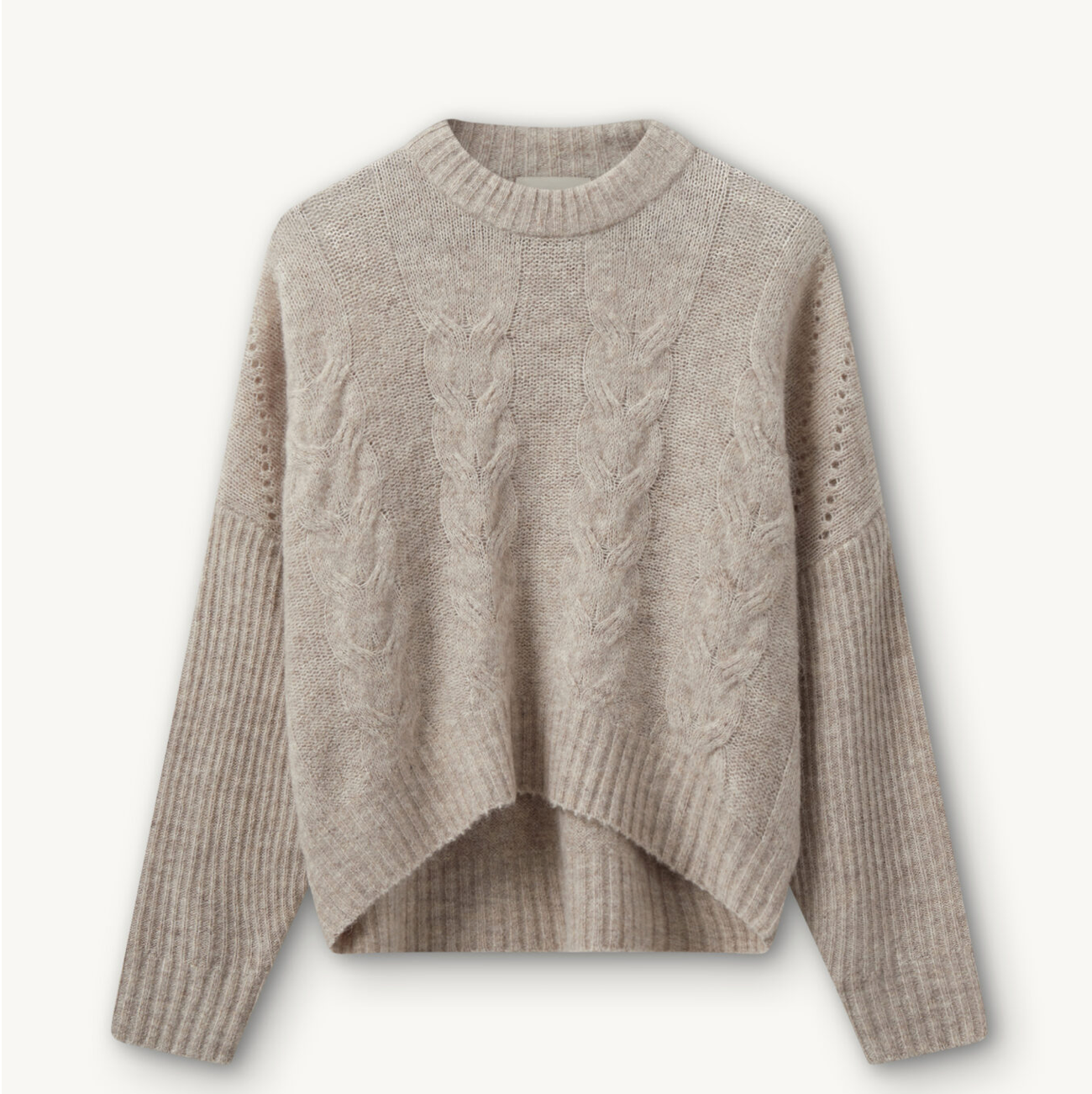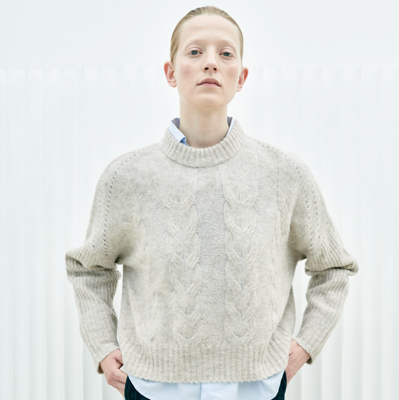 The Verbier Boxy Cable Sweater its combination of soft alpaca wool with cable artwork. The attention to detail creates a garment that is not only warm and comfortable but also a stylish statement piece that can elevate your winter wardrobe.