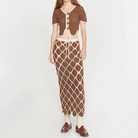 Each Vitória Crochet Skirt takes up to one week to make and is made in Brazil. Each diamond shape, inspired by the Harlequin, is individually hand-made in café and ivory tones and attached one by one to make this mid ankle length skirt. Use the crocheted drawstrings so that you can pull it snug to best fit your body.