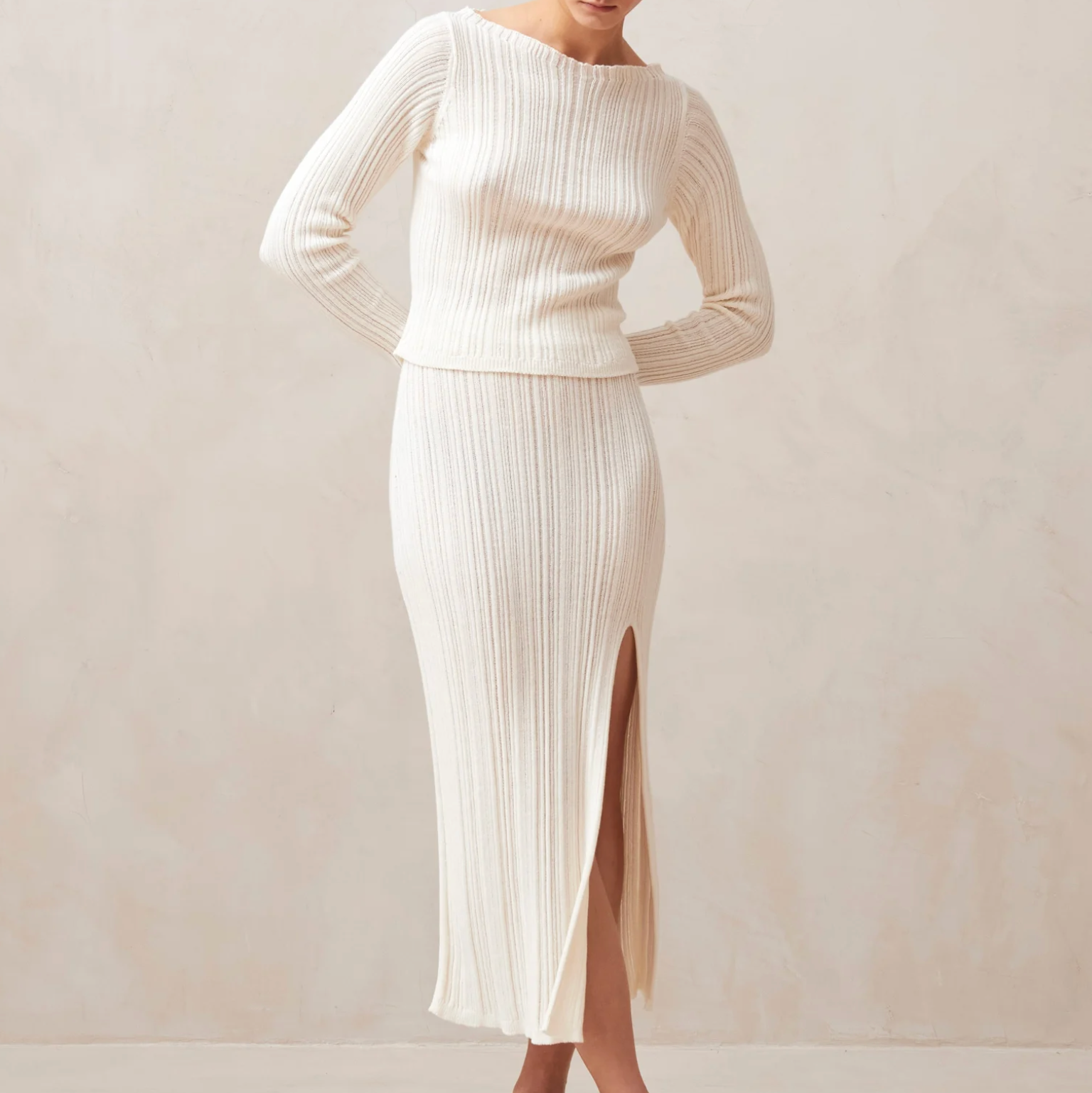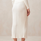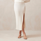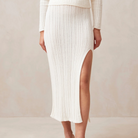 So long, complicated fashion! Made from soft ribbed cotton in a fresh white hue, the Zoe midi skirt skims your curves and gives you shape without being too snug. It has an elasticated, high-rise waist and a generous, tight-grazing slit for easy movement. Wear it with the matching Elise top to look seriously chic or with a chunkier cable-knit for all your casual fall activities.