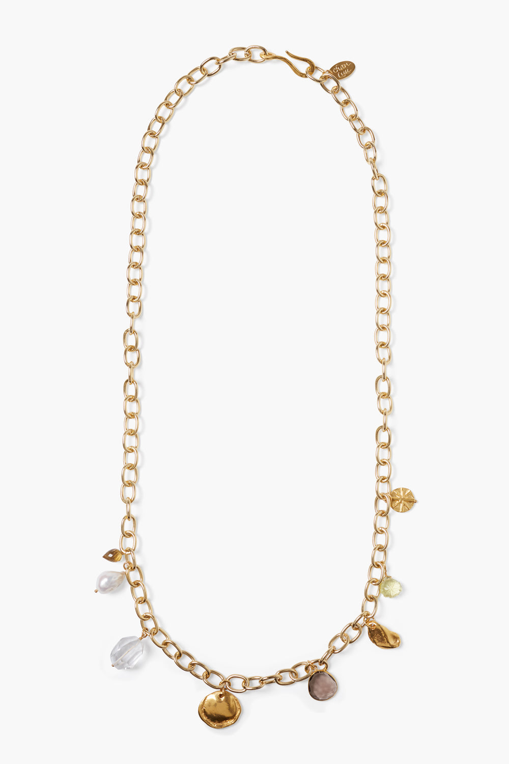 This gold plated base metal necklace shimmers with lemon topaz, quartz, baroque pearl, and gold coins.