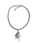 Our signature fish pendant in gold plating with a green cubic zirconia eye hung from a braided silk cord. Available on black or grey cord to suit your personal style.