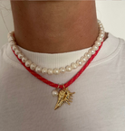 Our Manon Necklace boasts a stunning spike shell pendant and a genuine freshwater pearl, all strung on a vibrant red and yellow paracord.