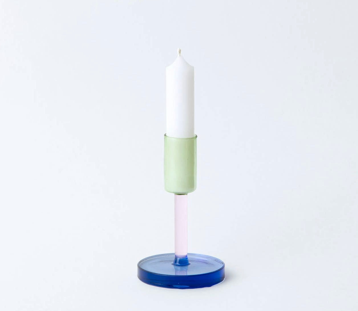Our dual colour glass candlestick holder is a beautifully crafted piece that is perfect for adding a splash of colour to your dining table or shelf. This holder is made from borosilicate glass for a clean and smooth finish, and it is hand wash only. Our holder measures 70 x 70 x 120mm and has a diameter of 2.7 x 4.7 inches.