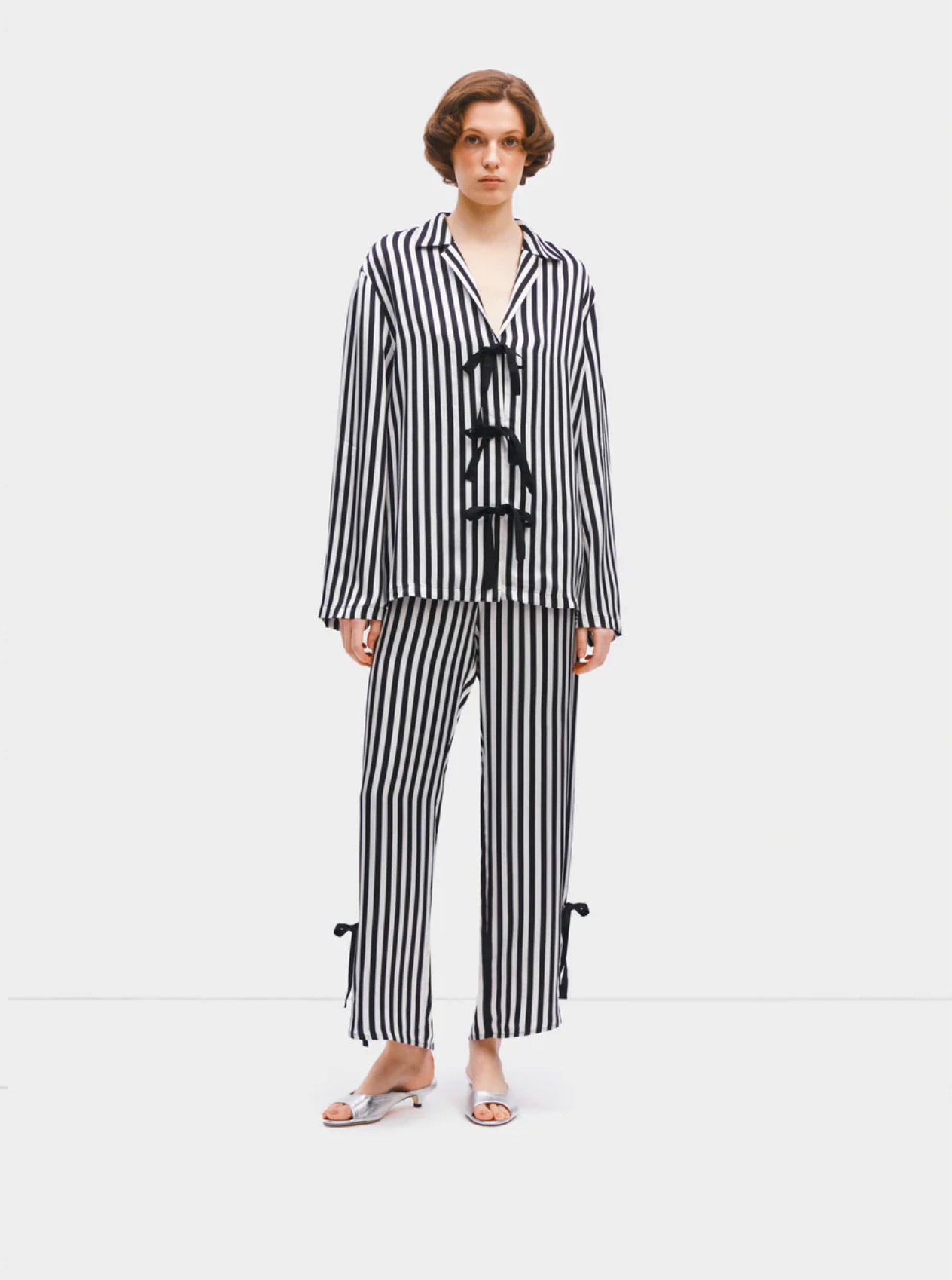 This relaxed fit set includes a long-sleeve shirt featuring three tie closures, a camp collar, and a straight hem, complemented by wide-leg trousers with a high elasticated waist and cropped length. The trousers are designed with a curved bottom that has slits and bows for a refined touch. Ideal for casual outings or relaxed gatherings, this set offers versatile styling options. The breathable fabric ensures comfort, while the thoughtful design elements provide a polished yet effortless look, making it easy to pair with flats, sandals or sneakers for a laid-back look.