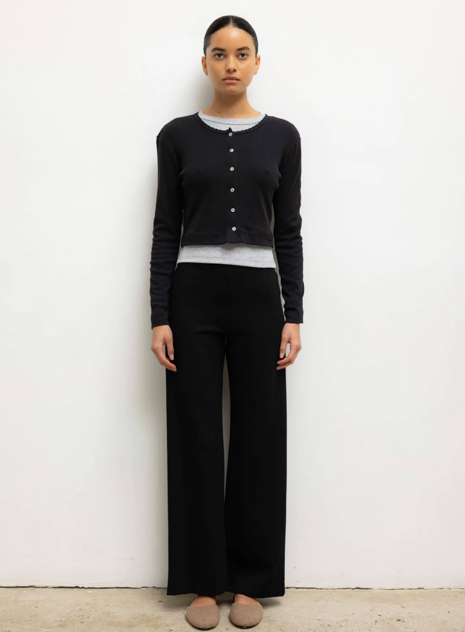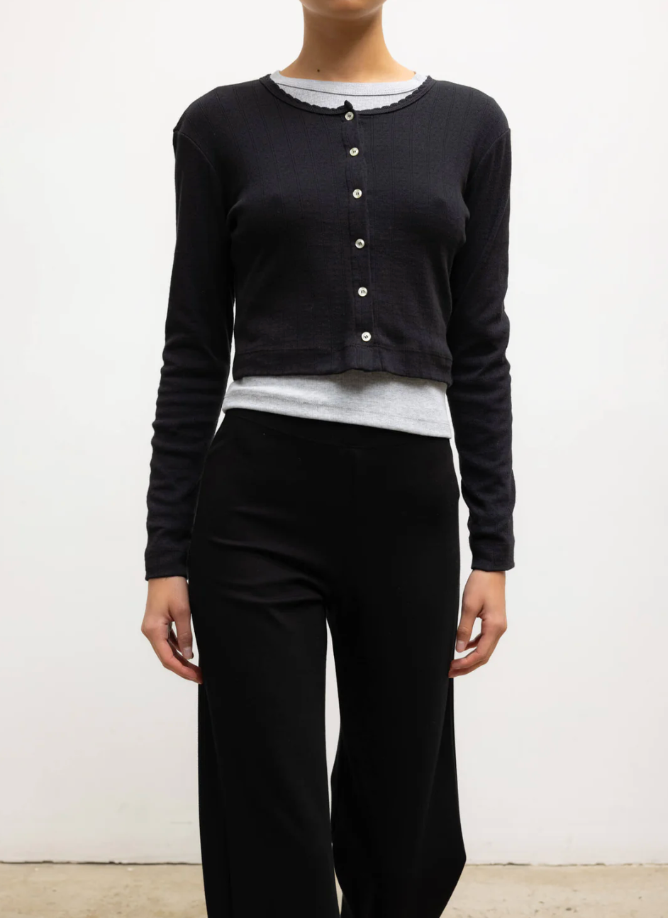 Cut in our nostalgic Pointelle Cotton, The Pointelle Crop Cardigan is the cropped length sister to our bestselling Pointelle Classic Cardigan. Featuring signature pinhole stripes, dainty eyelets, and scalloped edging. Wear it buttoned up as a top or over any matching Pointelle top.