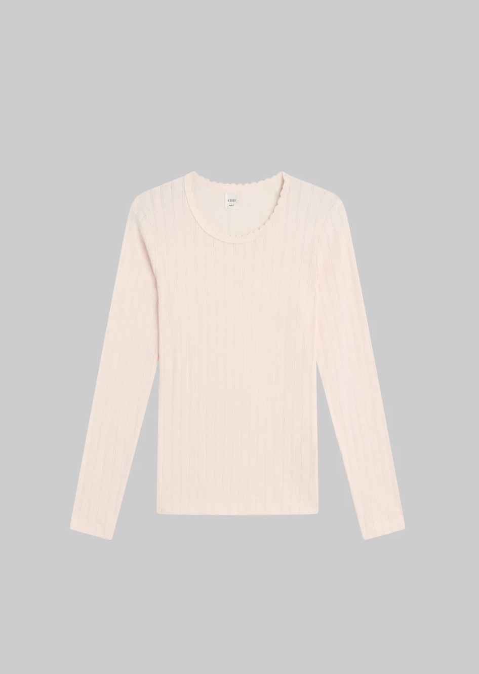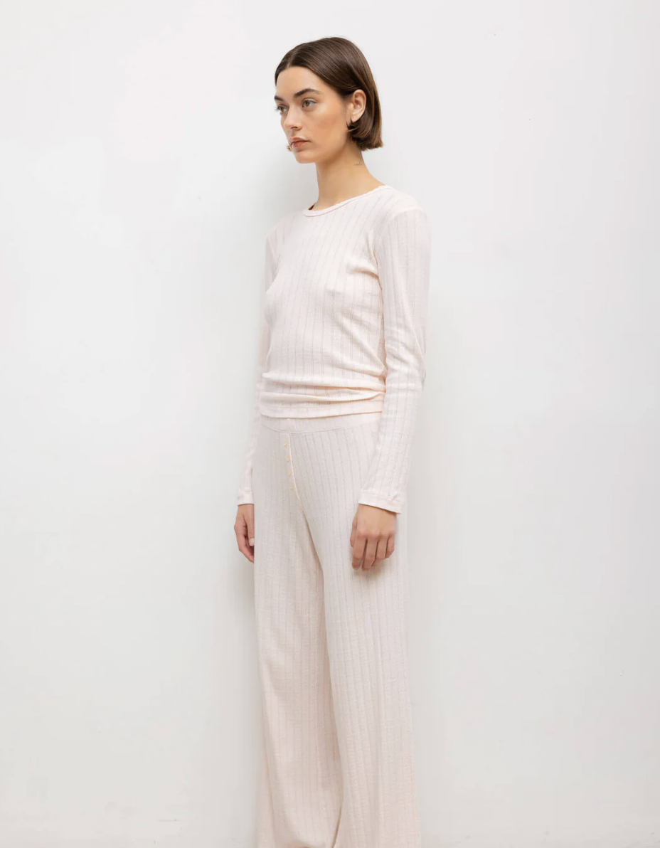 Cut in our nostalgic Pointelle Cotton, The Pointelle Slim Fit Long Sleeve features a classic crew neckline with our signature pinhole stripes, dainty eyelets, and scalloped edging. Full length with fitted long sleeves.