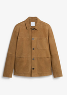 - Features: Men’s suede chore jacket made from 100% caprine leather suede for an ultra soft feel. Cut at waist length with panel detailing and lined for comfort. Designed with three outer patch pockets, an internal pocket, and custom Percival buttons. A durable real leather designer jacket with practical storage and a refined finish.