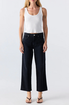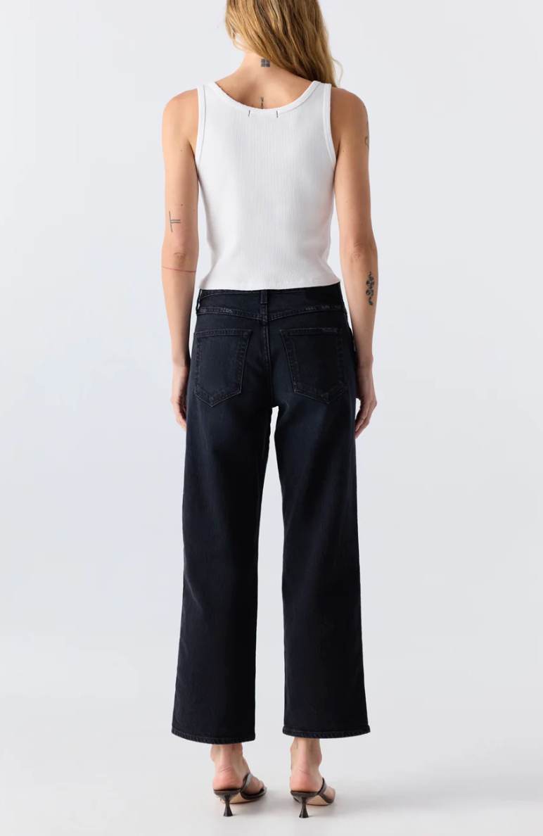 This cropped, wide straight leg is our easiest fit yet. Cut from premium vintage stretch denim with a mid rise, this pair is meant to sit low on the hips for a relaxed look. Thoughtful distressing throughout. Zip fly.