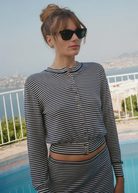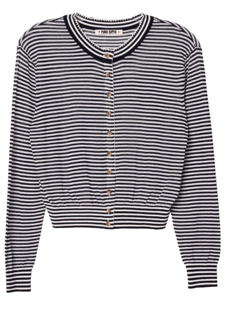A new take on our sheer knit staples, the Hydra Cardigan in Midnight Stripe is a slightly cropped, lightweight cardigan.