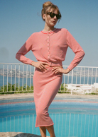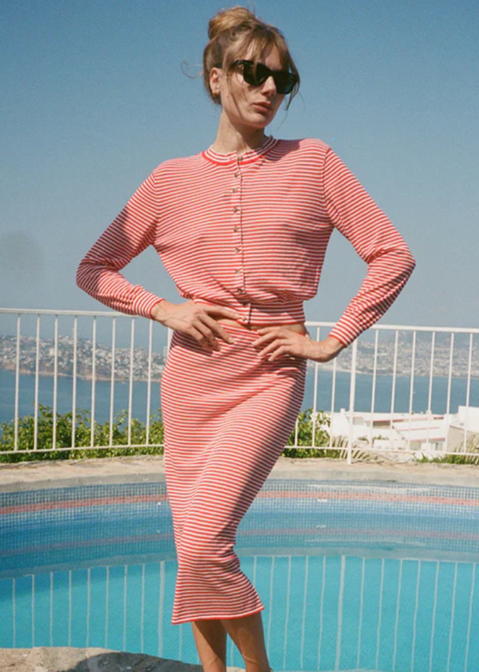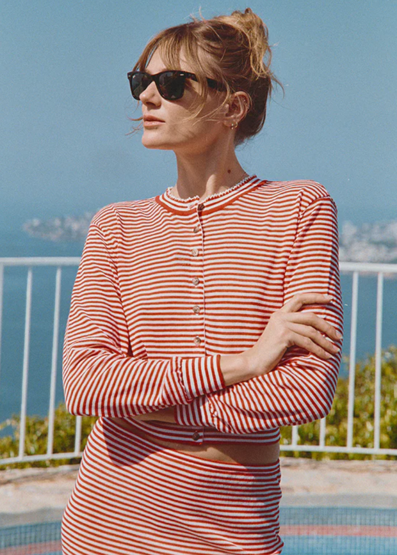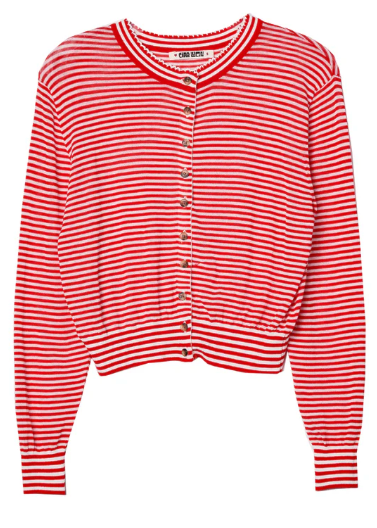 A new take on our sheer knit staples, the Hydra Red Stripe Cardigan is a slightly cropped, lightweight cardigan.