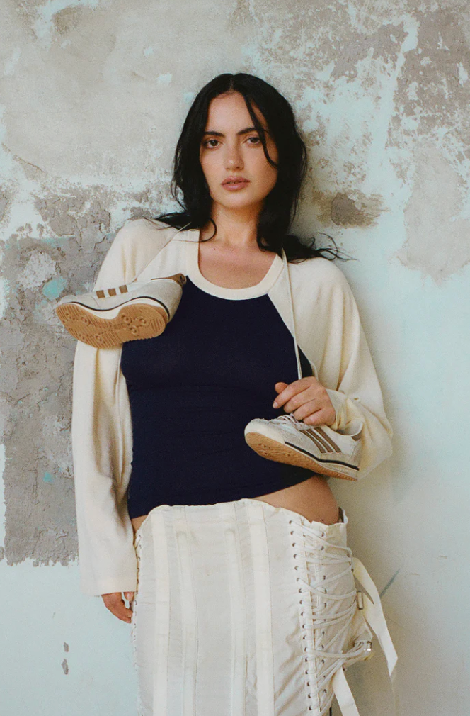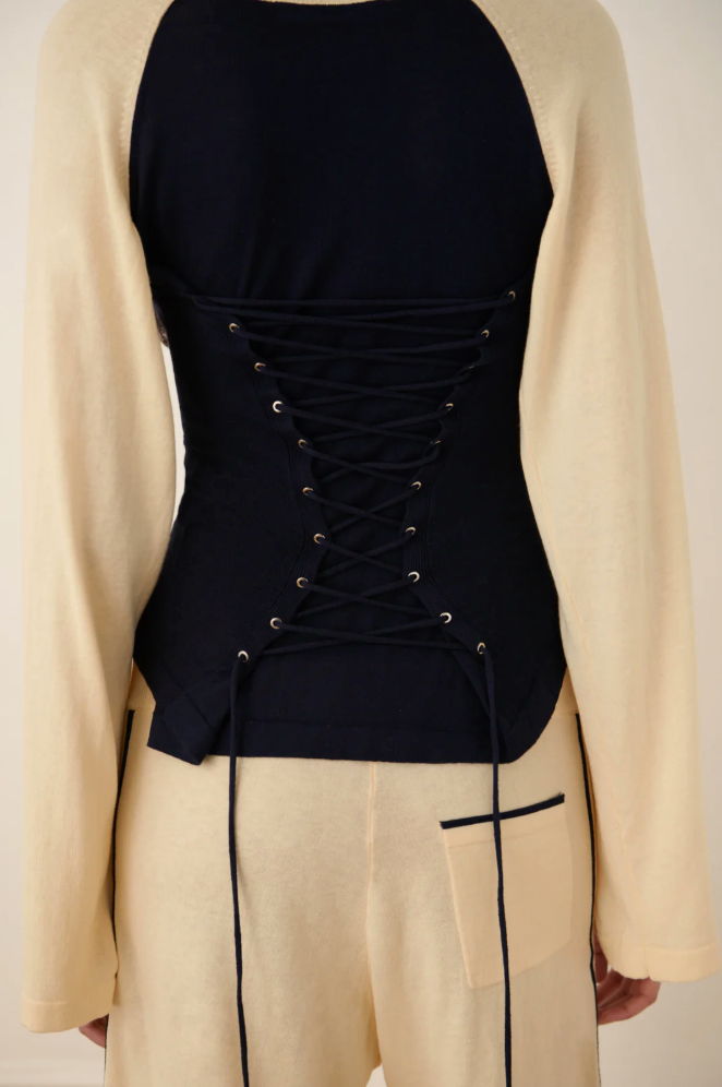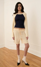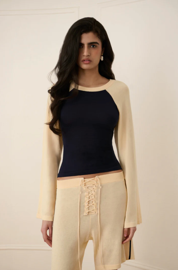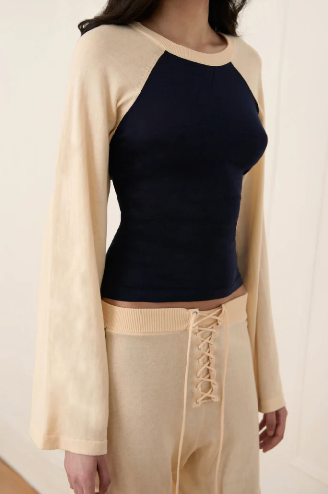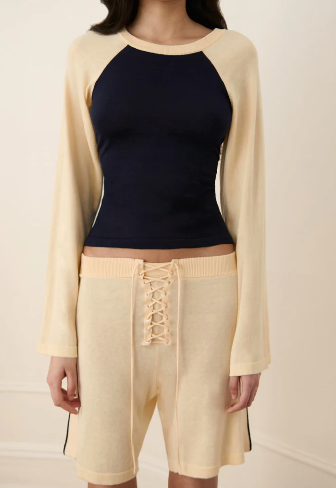 Sporty and feminine, this reversible raglan shirt is inspired by vintage American heritage sportswear. A corset-inspired lace-up cinches the waist whether worn front or back, balancing athletic edge with effortless femininity. Crafted from a soft cotton and silk blend that mimics the broken-in feel of a well-loved vintage jersey, it’s as comfortable as it is polished. Finished in timeless navy and antique cream.