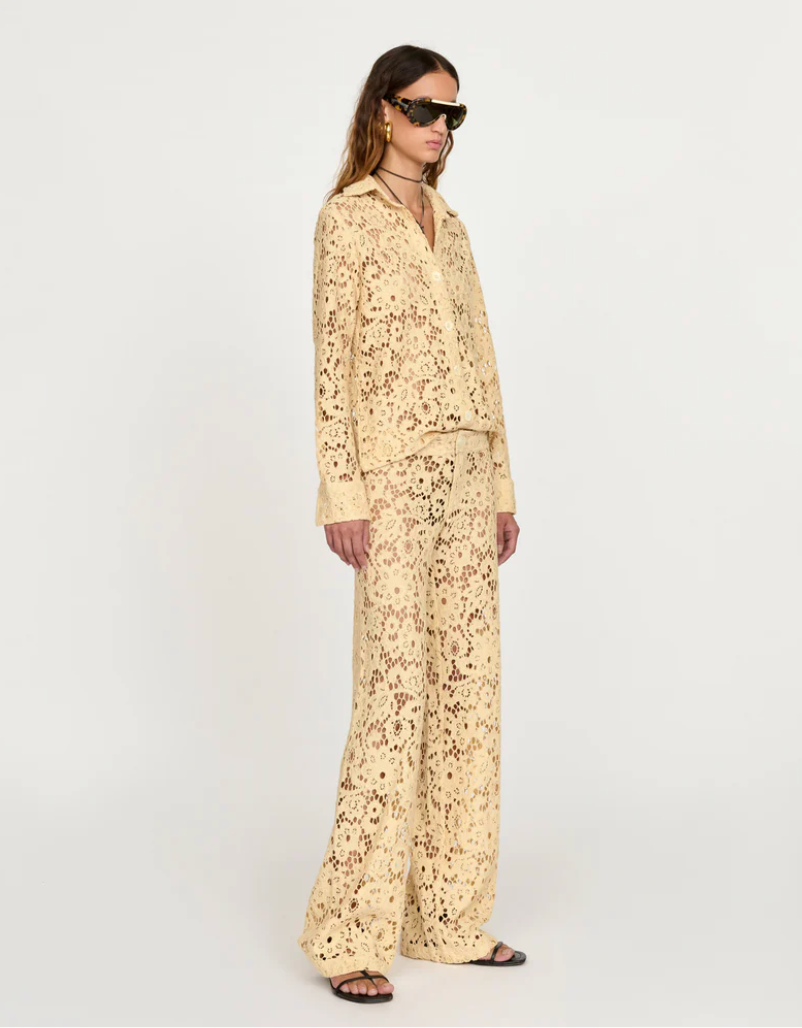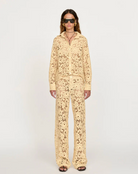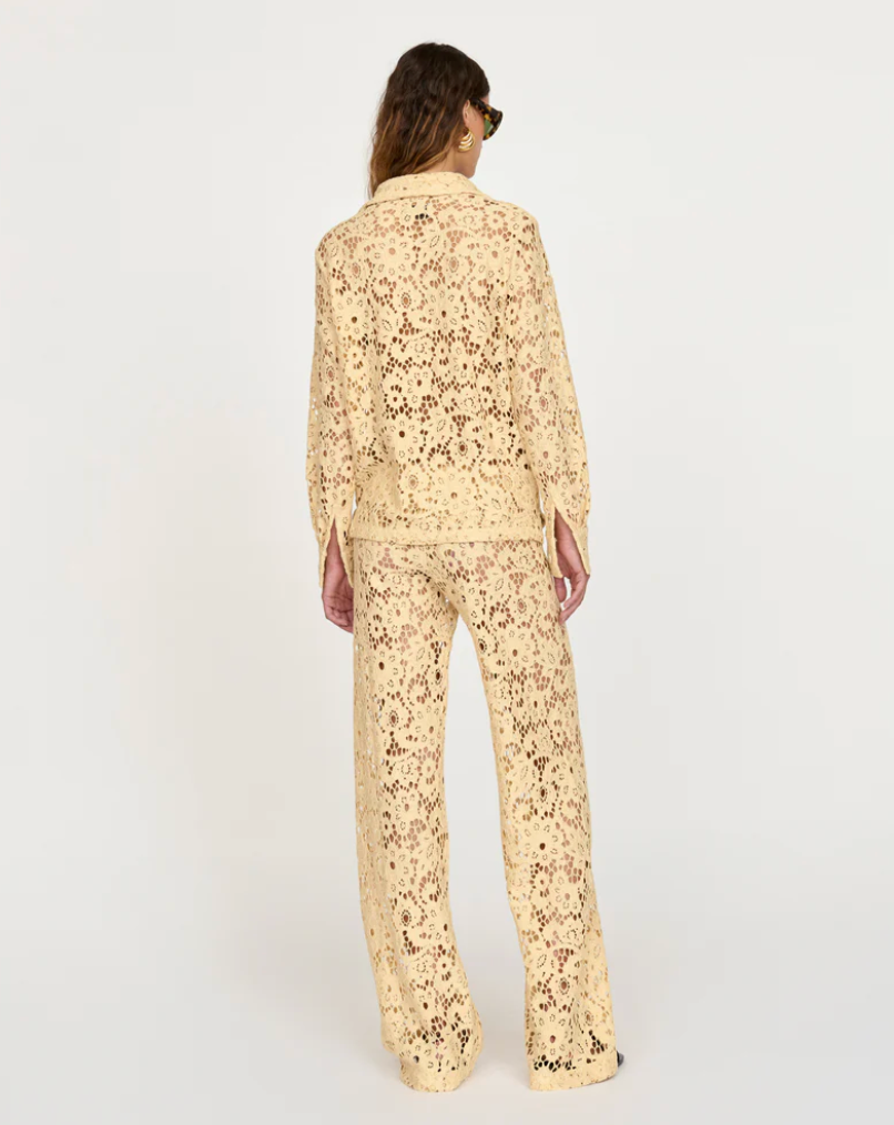 The Rafa Pant is crafted from 100% cotton lace with a soft, open floral pattern. The fabric has a weighted, vintage-inspired feel that drapes easily while holding its shape. Mid-rise with a relaxed, wide-leg fit, it pairs seamlessly with the Gabriel Top for a complete look. Styled here with skin-toned undergarments for a clean, continuous finish.