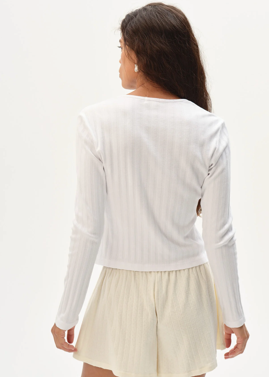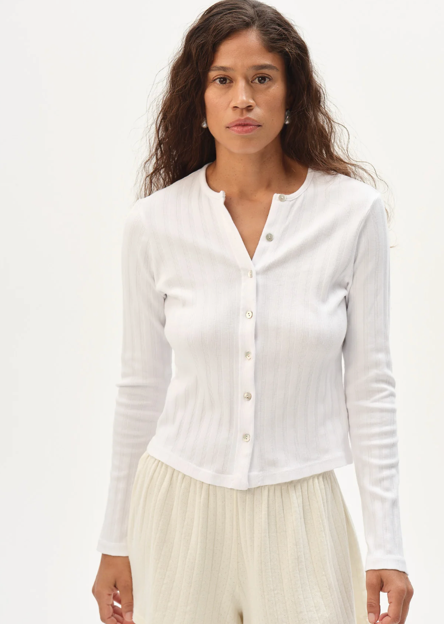 The Varied Rib Cardigan is crafted from 100% cotton and features a crew neckline, textured variegated ribbing throughout, mother-of-pearl buttons, and a slim fit.