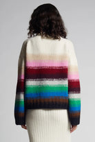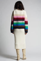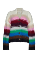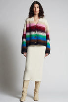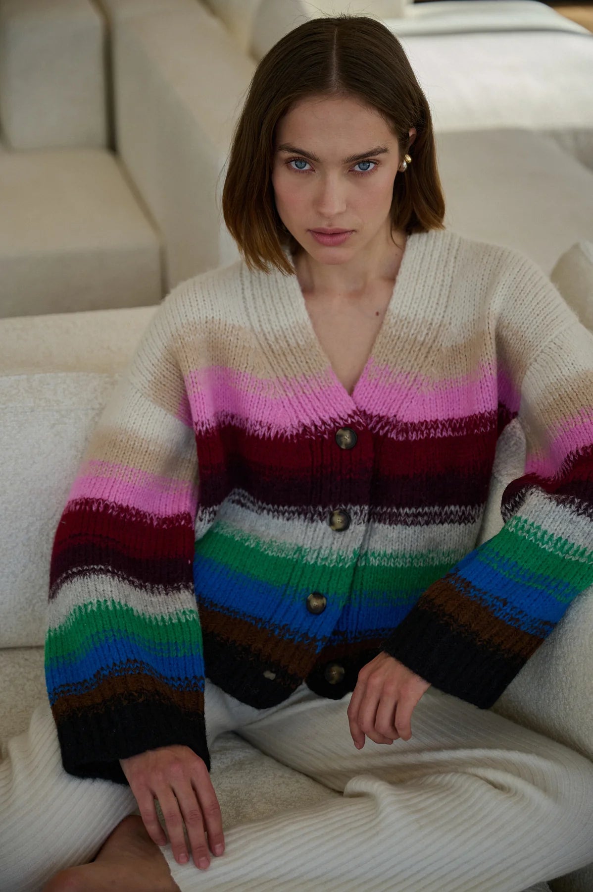 The Alaina Cardi is a roadmap of the collections color palette in an emotional, eye-catching ombre-pattern in super-soft alpaca-blend yarn. With a relaxed, easy fit straight sleeve, style this cardi solo button-up or layer effortlessly.