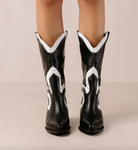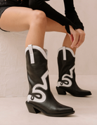These black and white leather cowboy boots are a trendy addition to any fall wardrobe. With a classic silhouette, these boots feature subtle embroidery along the pointed toe and classic pull tabs. The contrast swirl pattern around the instep and back of the calf adds a touch of western flair.