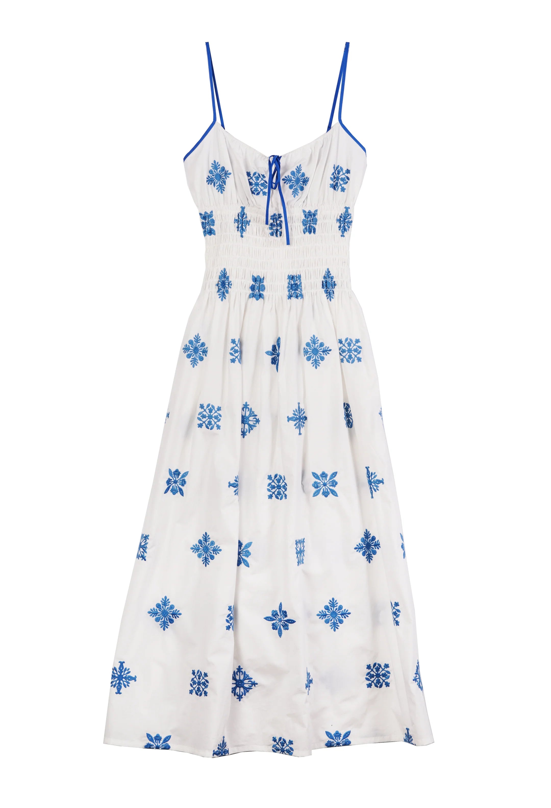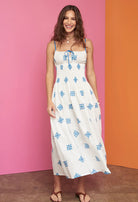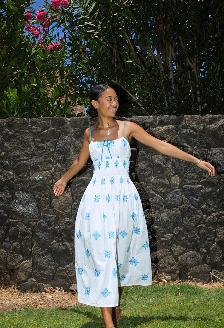 The Barbara Dress in sky is an embroidered cotton spaghetti strap dress featuring a keyhole tie at the bust and a smocked bodice. Straps are adjustable. 100% cotton.