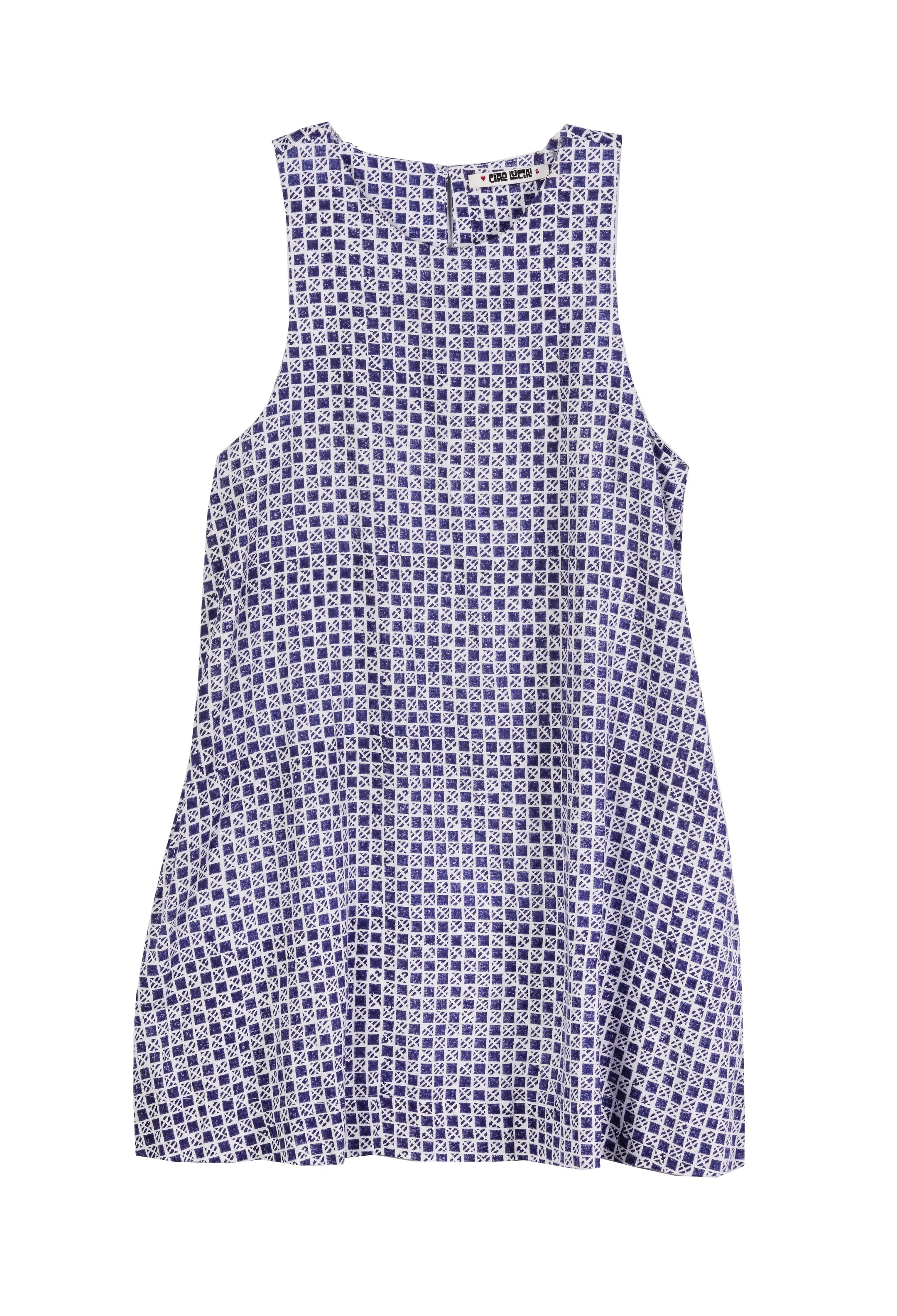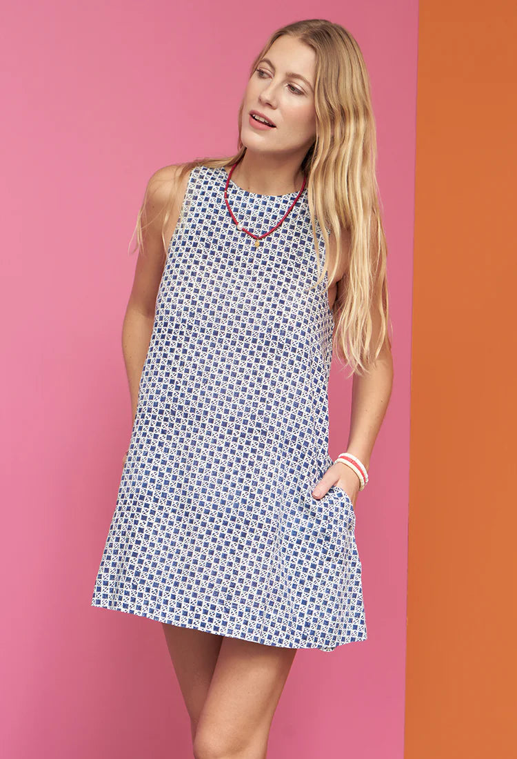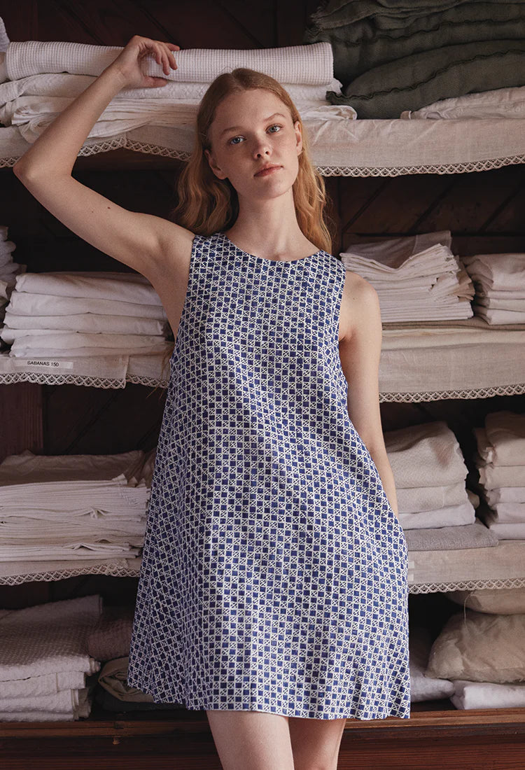 The Basque Dress in flag is a printed sleeveless cotton-linen blend mini dress with two side seam pockets and keyhole closure at the neck. 65% Cotton, 35% Linen