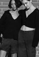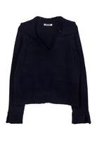 The Belinha Pullover is an oversized v-neck sweater with a wide collar and notch sleeves.