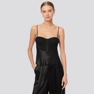 The Bernadette Cami is a delicate and feminine camisole with a corseted bust construction and a silk charmeuse bottom. It features underwire and boning for extra support, and has an invisible zipper at the back for a sleek look. It is made of stretch lace and is dry clean and steam only. The model is wearing a size 0 and is 5'10.