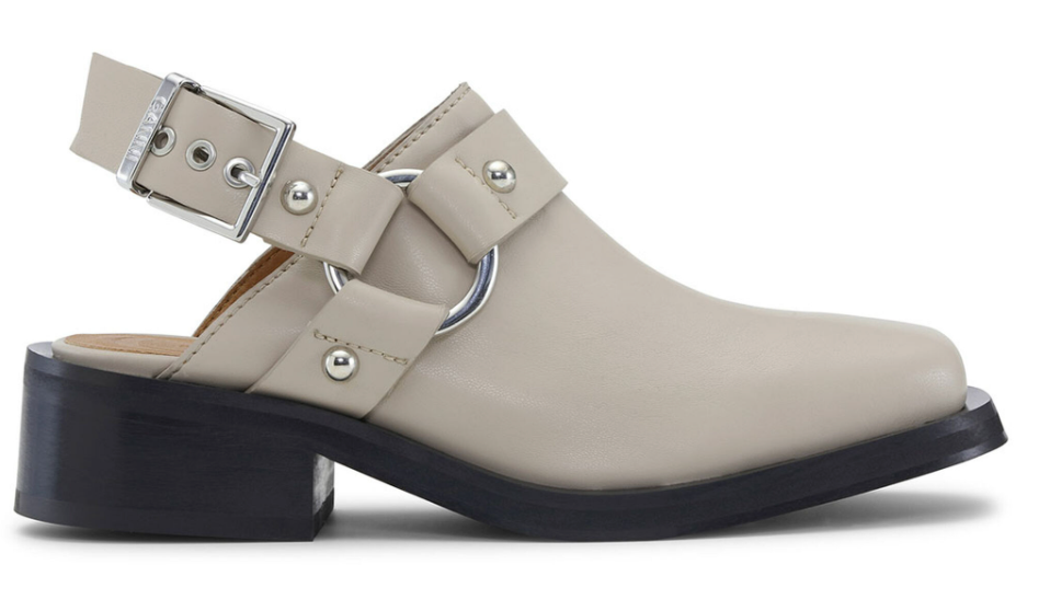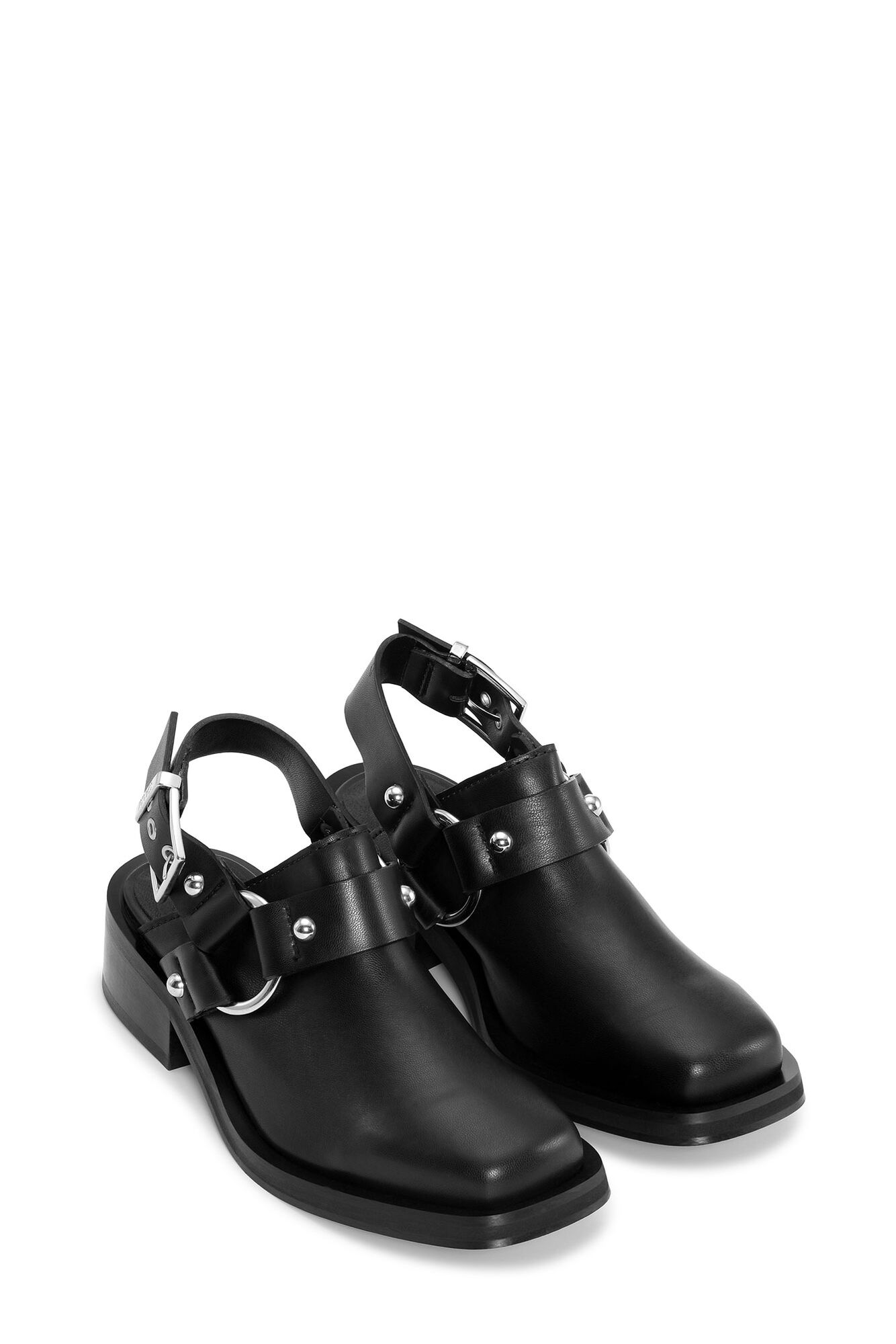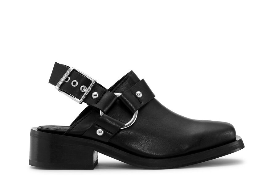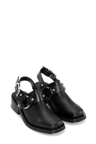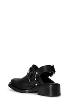 These Black Slingback Biker Mules are designed in a low-cut style and feature a backless design, adjustable slingback strap, buckle details and block heels.