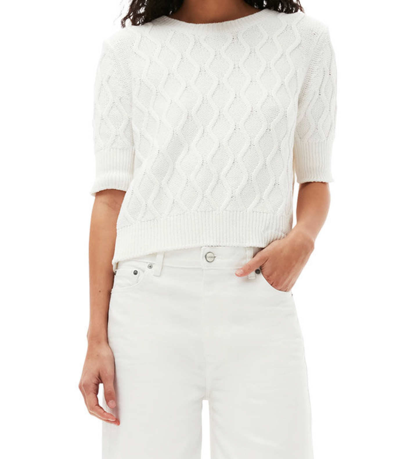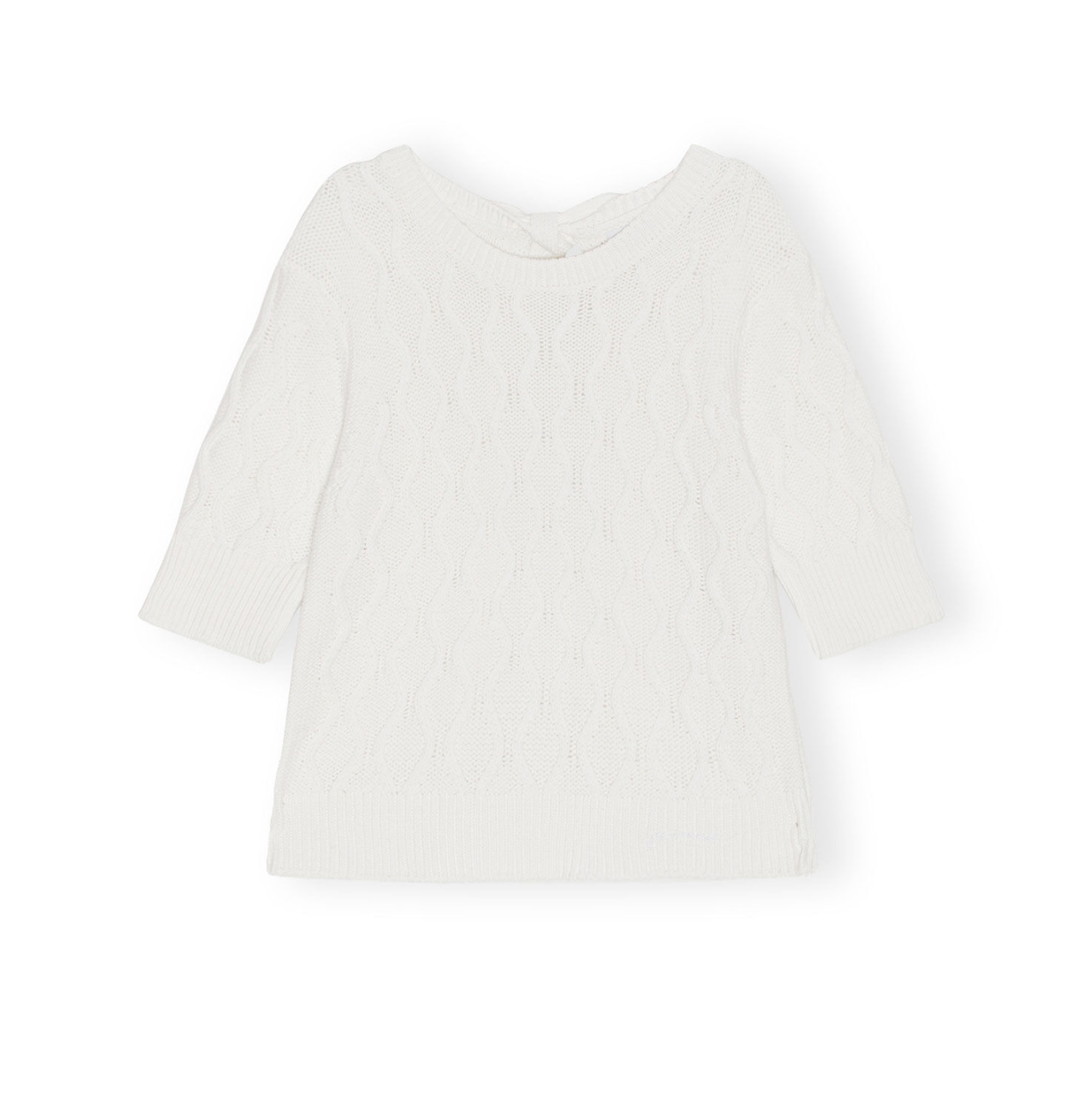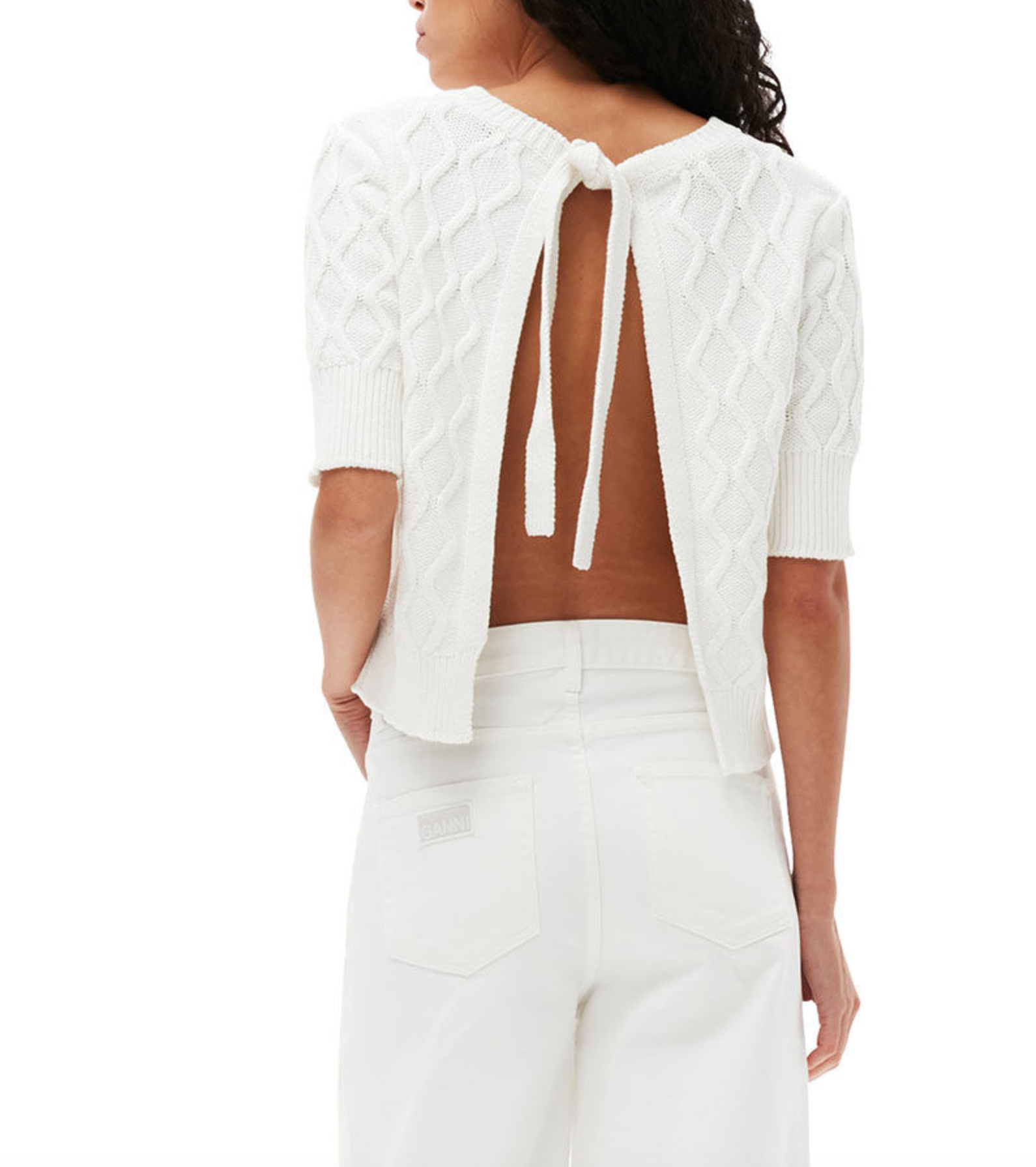 This Cotton Cable Open Back Top is made from organic cotton. The top is designed for a regular fit and features a round neckline, elbow-length sleeves, open back with a tie band, ribbed edges and a cable knit design.