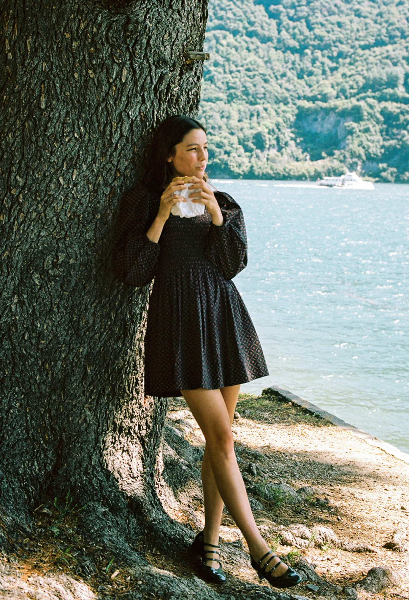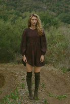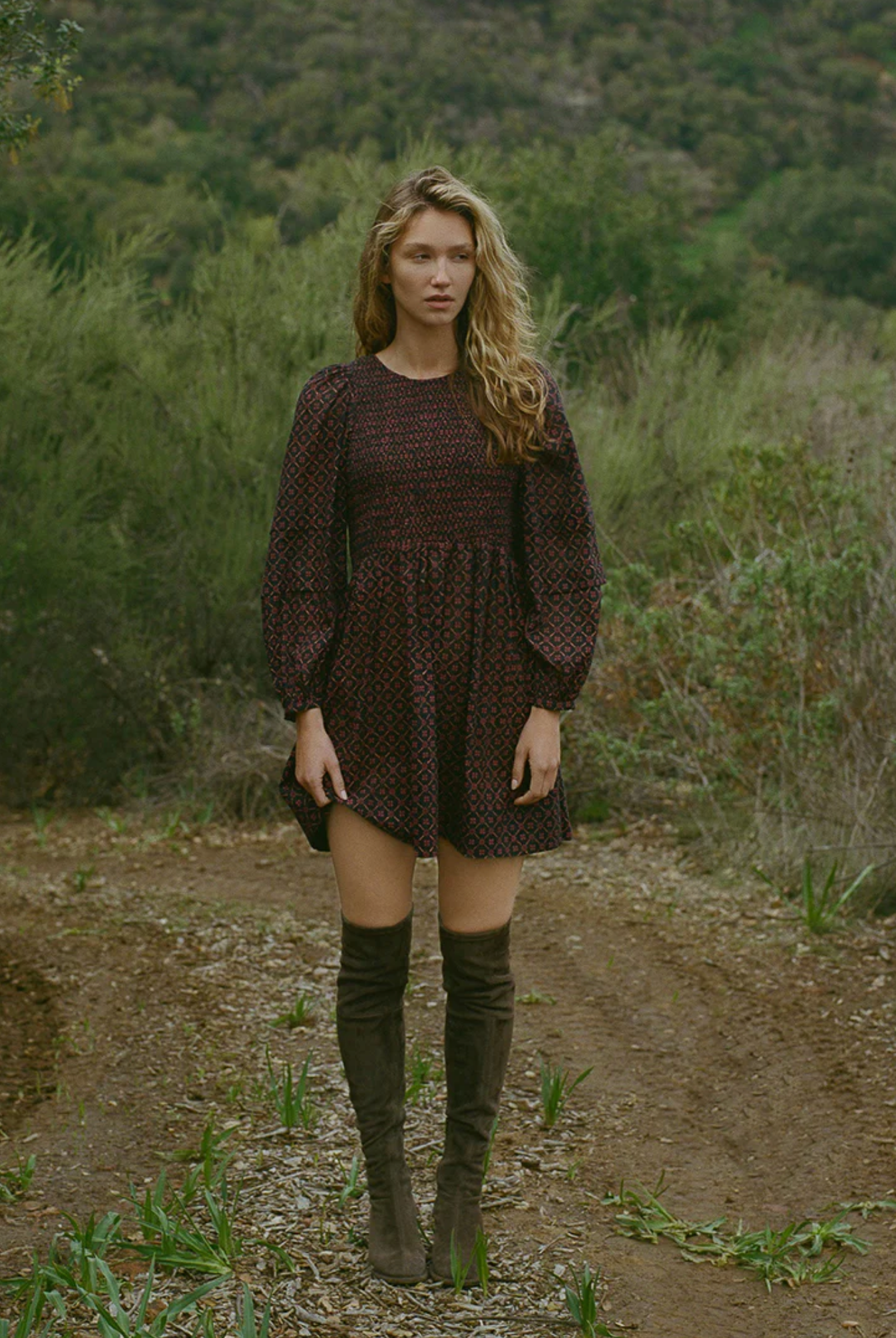 The Dajana Dress in currant is a printed long-sleeved cotton voile mini dress, featuring voluminous sleeves and a stretchy smocked bodice. Button closure detail at the back. This dress is perfect for a fun night out or a special event. The 100% cotton material is soft and comfortable, and the dress is available in sizes XXS-XL.