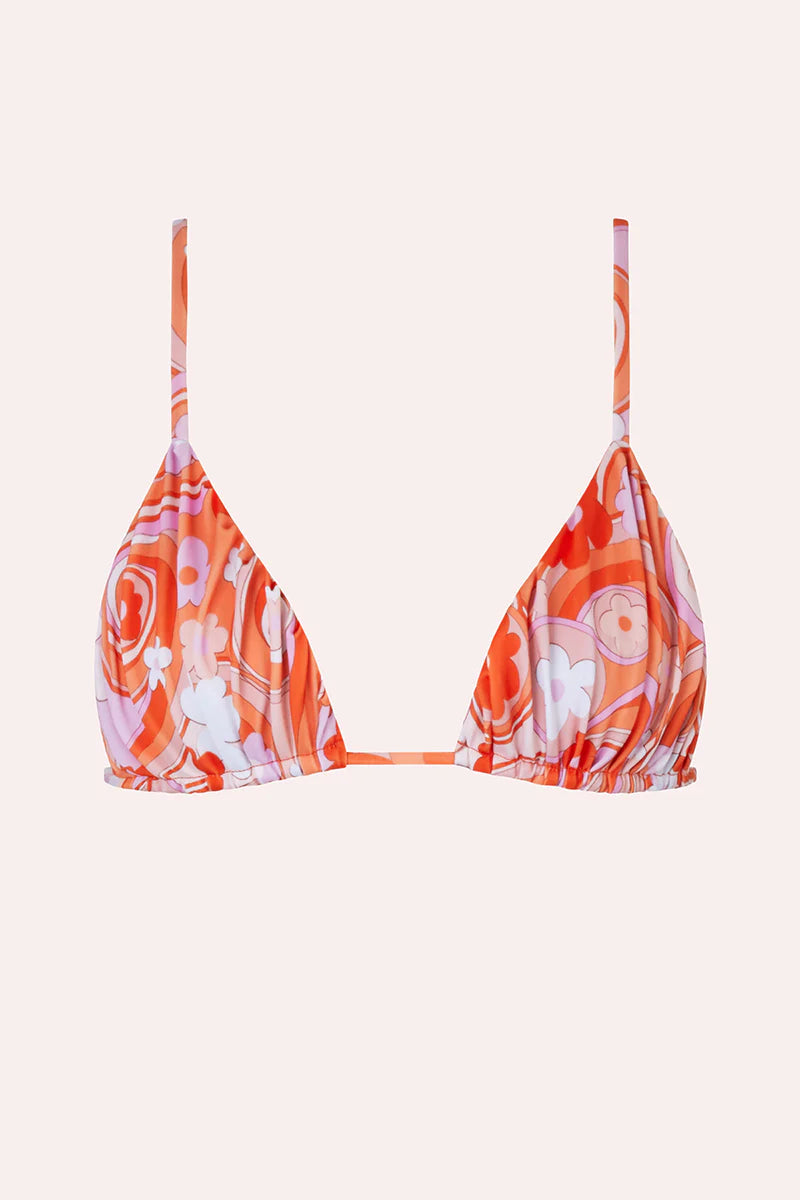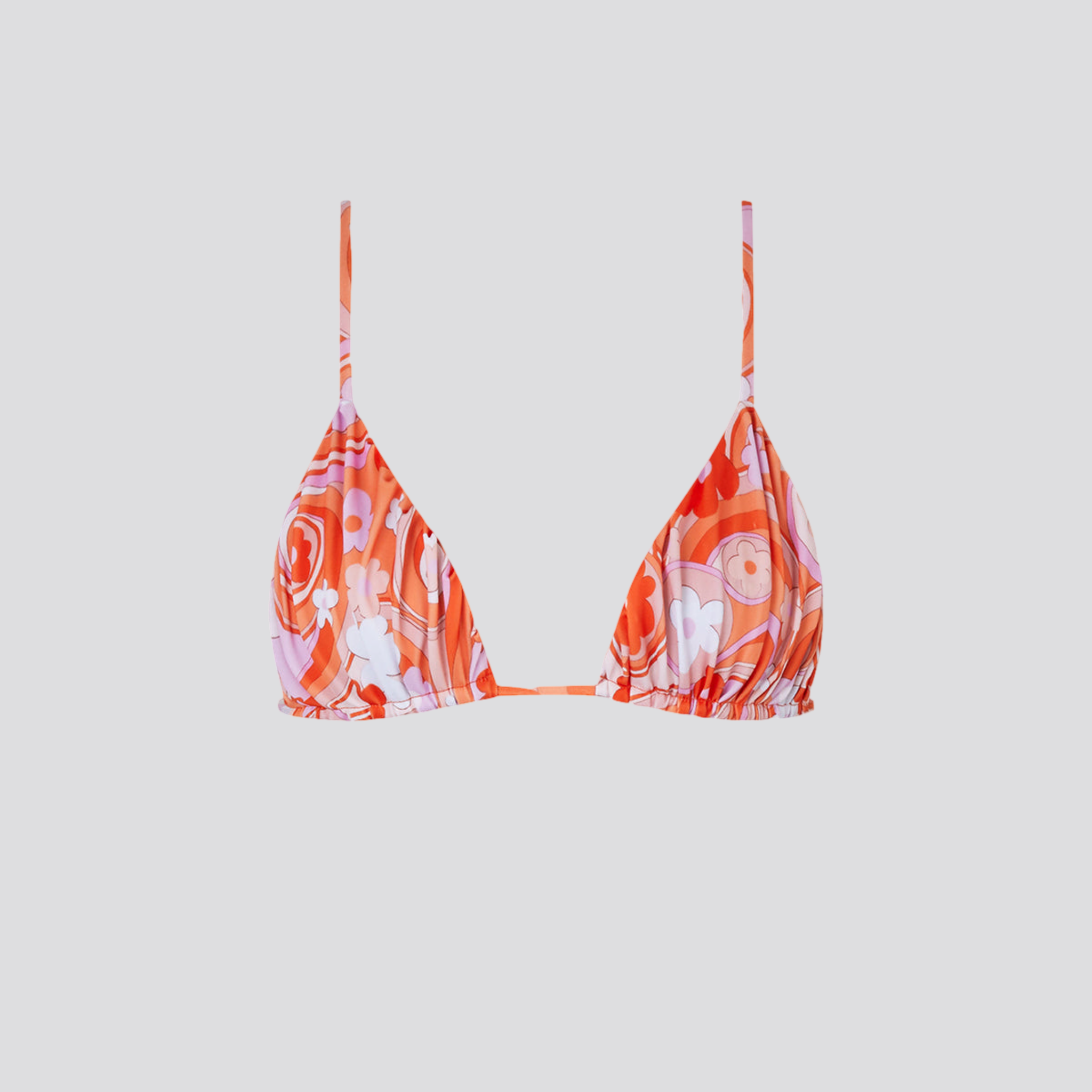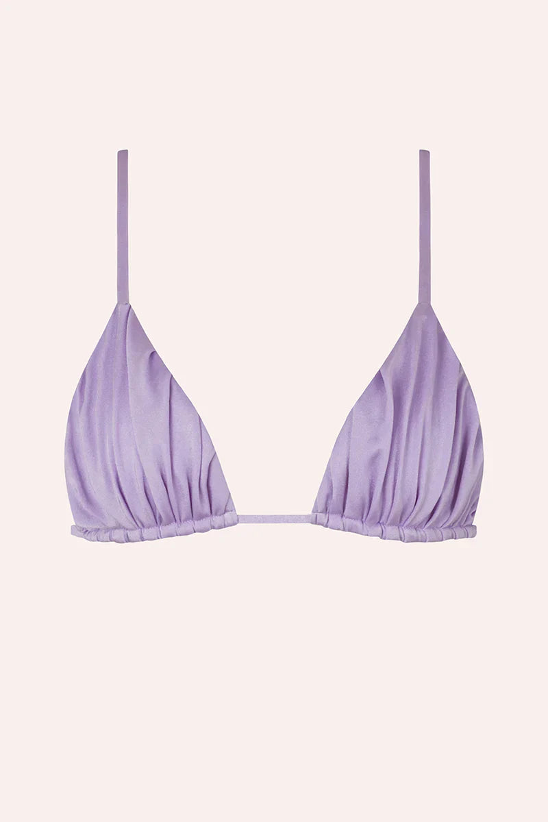 A classic, adjustable triangle top with feminine gathering a string tied back.