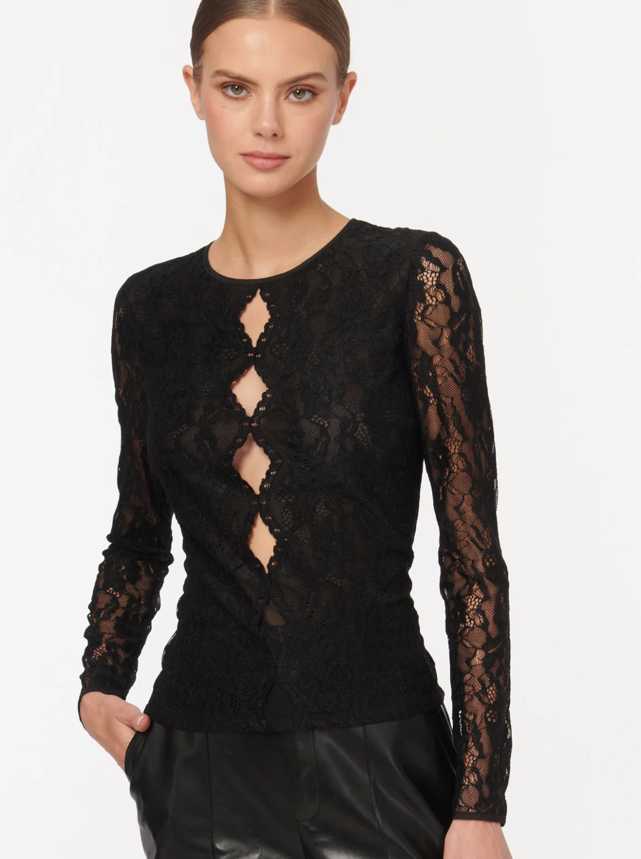 The Josefina Top is a beautiful lace blouse with a feminine flair. It is designed with scalloped lace at the center front creating dainty openings down the front bodice. The Josefina has a power mesh lining on the front bodice, with sheer sleeves and back. Finished with a keyhole button closure, it runs small so size up when ordering.