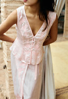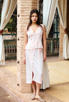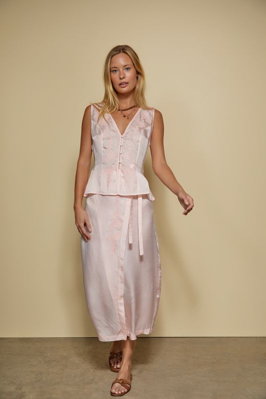 The Kora Skirt in ballet is a slightly sheer silky embroidered wrap skirt that ties at the side.