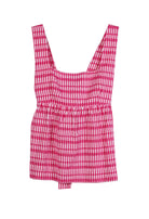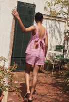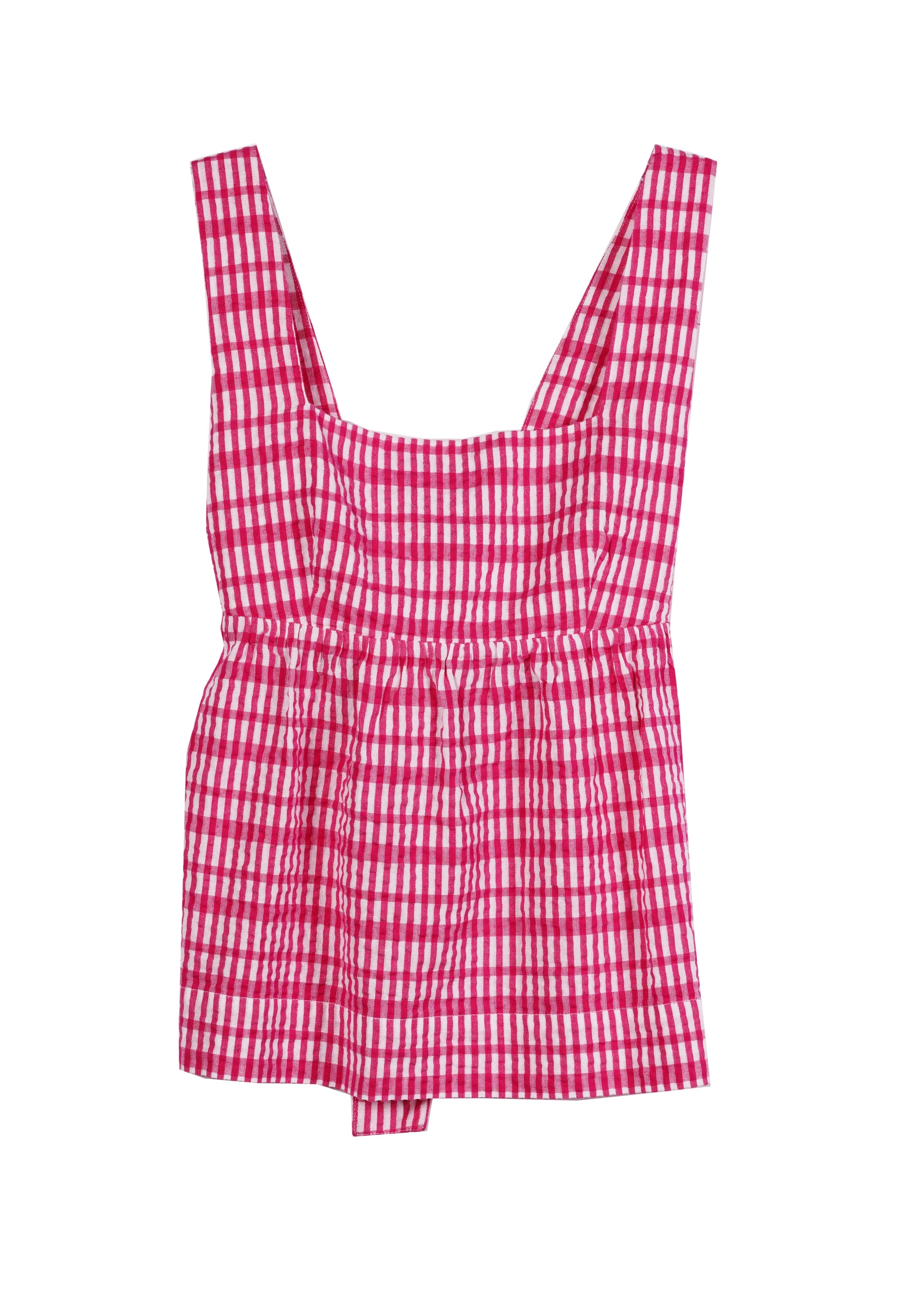 The Lola Top in hot pink gingham is a babydoll top with an empire bust, square neckline, and an open back with bow closure.