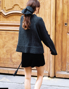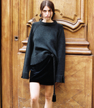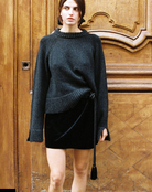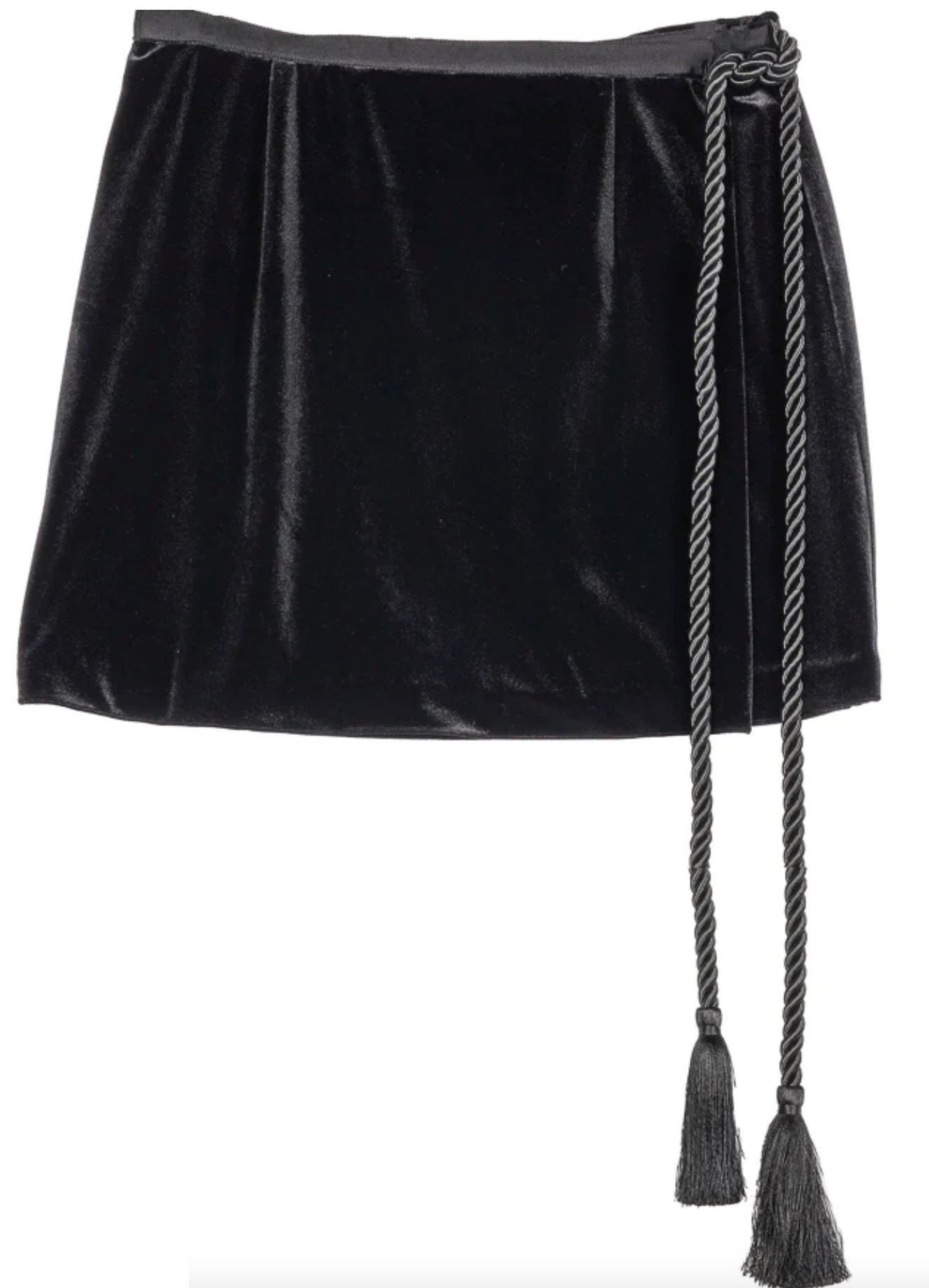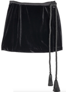 The Luz Skirt in black is a velvet mini wrap skirt featuring a black rope tie with tassels at the end.