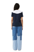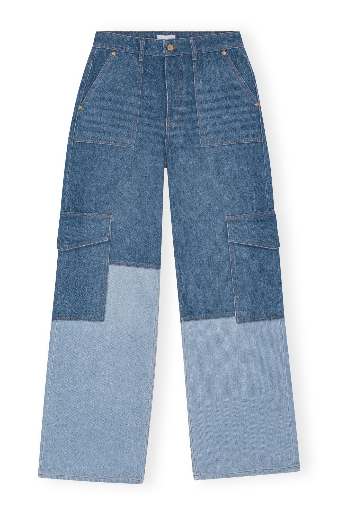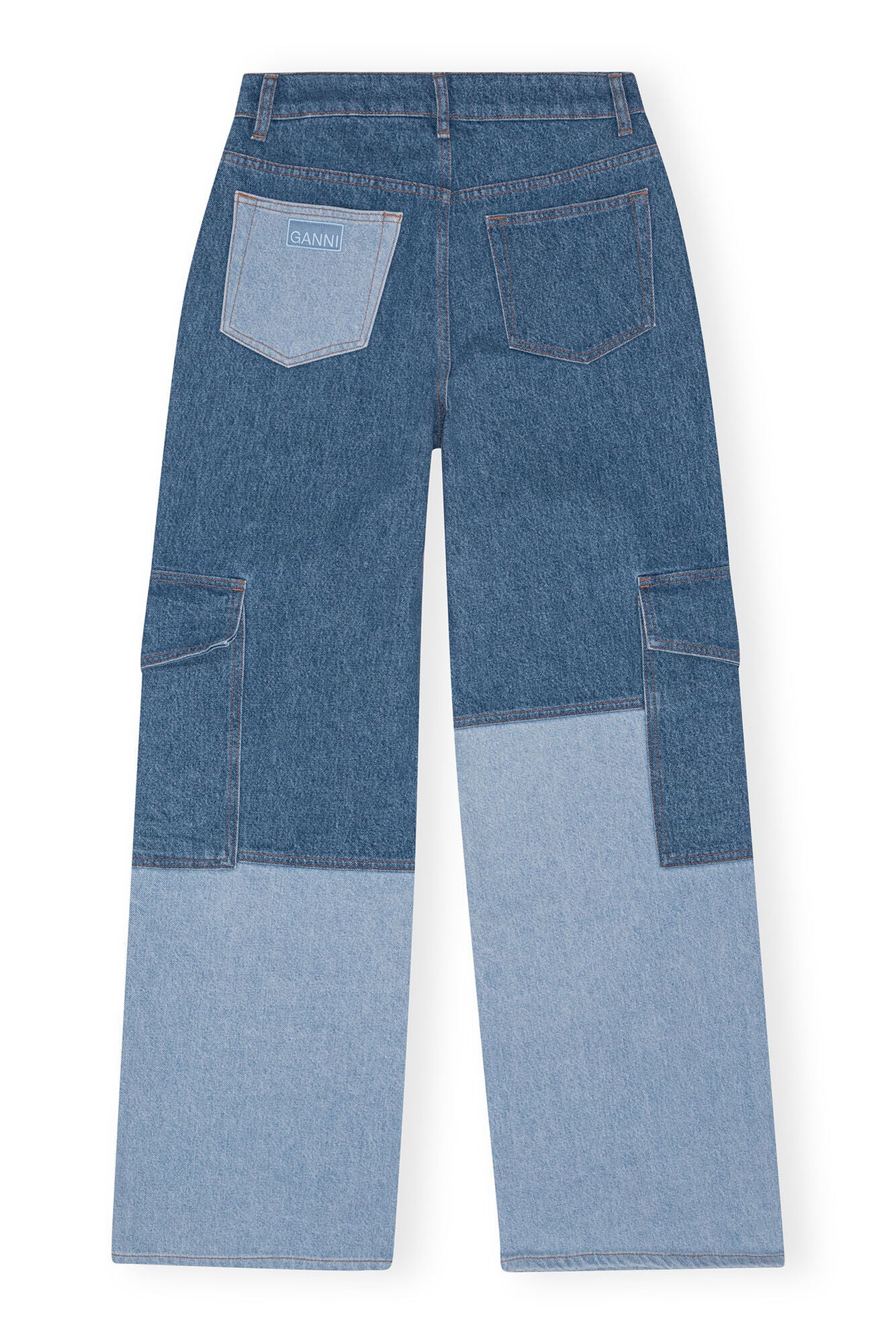 These Mid Blue Vintage Angi Jeans are made from organic cotton and feature a zip and button closure, belt loops, mixed denim, cargo pockets on the lower leg and a back pocket with a GANNI logo. The jeans are fitted at the waist and designed for a straight fit through the hip and thighs with wide straight legs.