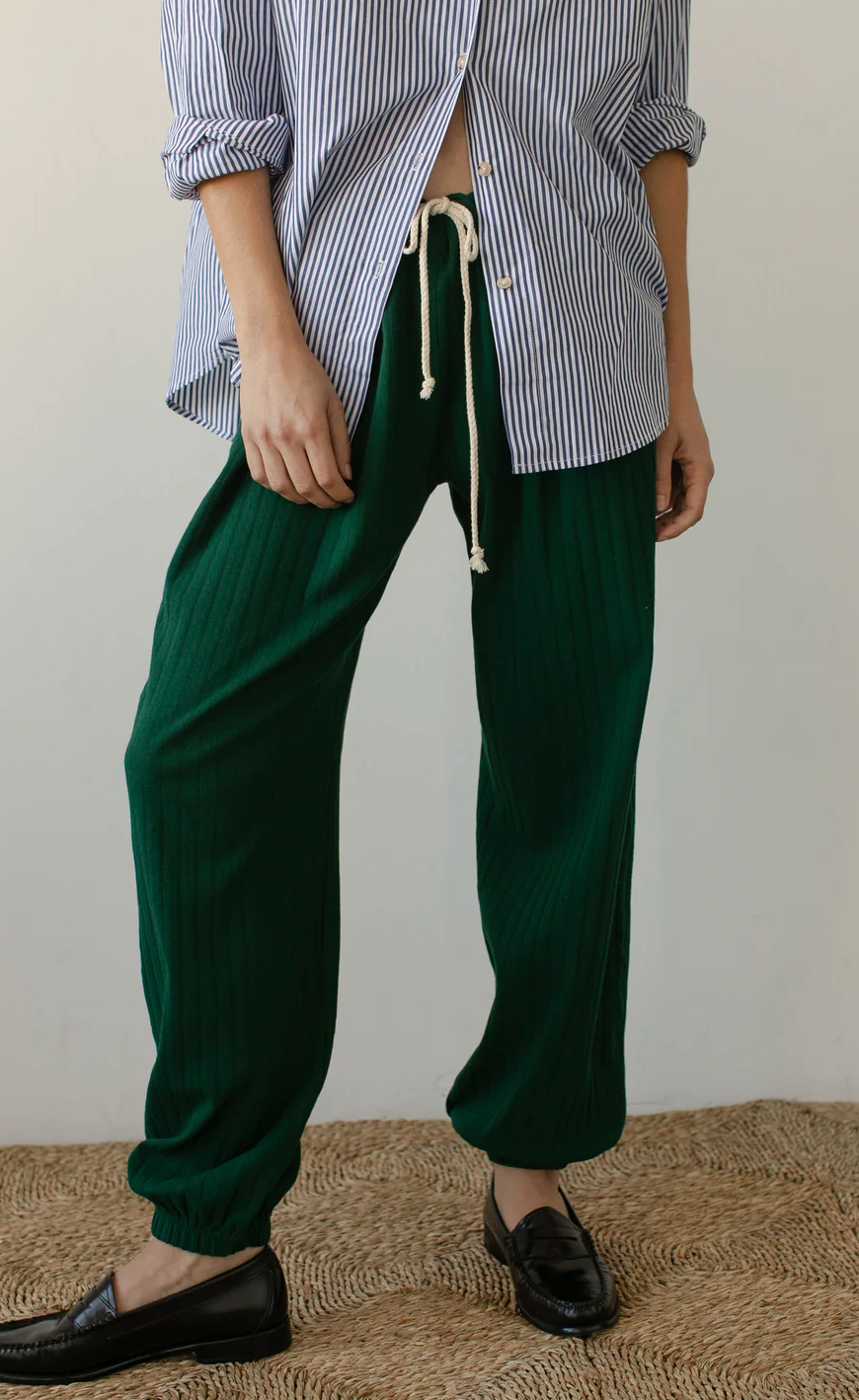 The Pointelle Cinch Pant is crafted from 100% organic cotton, featuring a drawcord waist, cinched ankle, billow leg and pointelle texture.