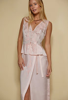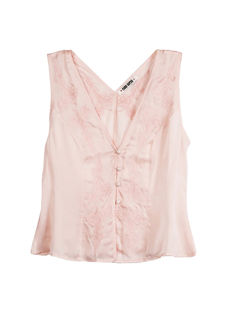 The Rina Top in ballet is a slightly sheer silky embroidered sleeveless blouse featuring a v-neckline and button front closure.