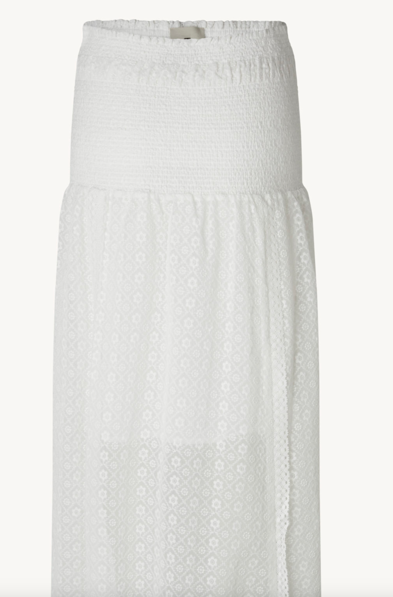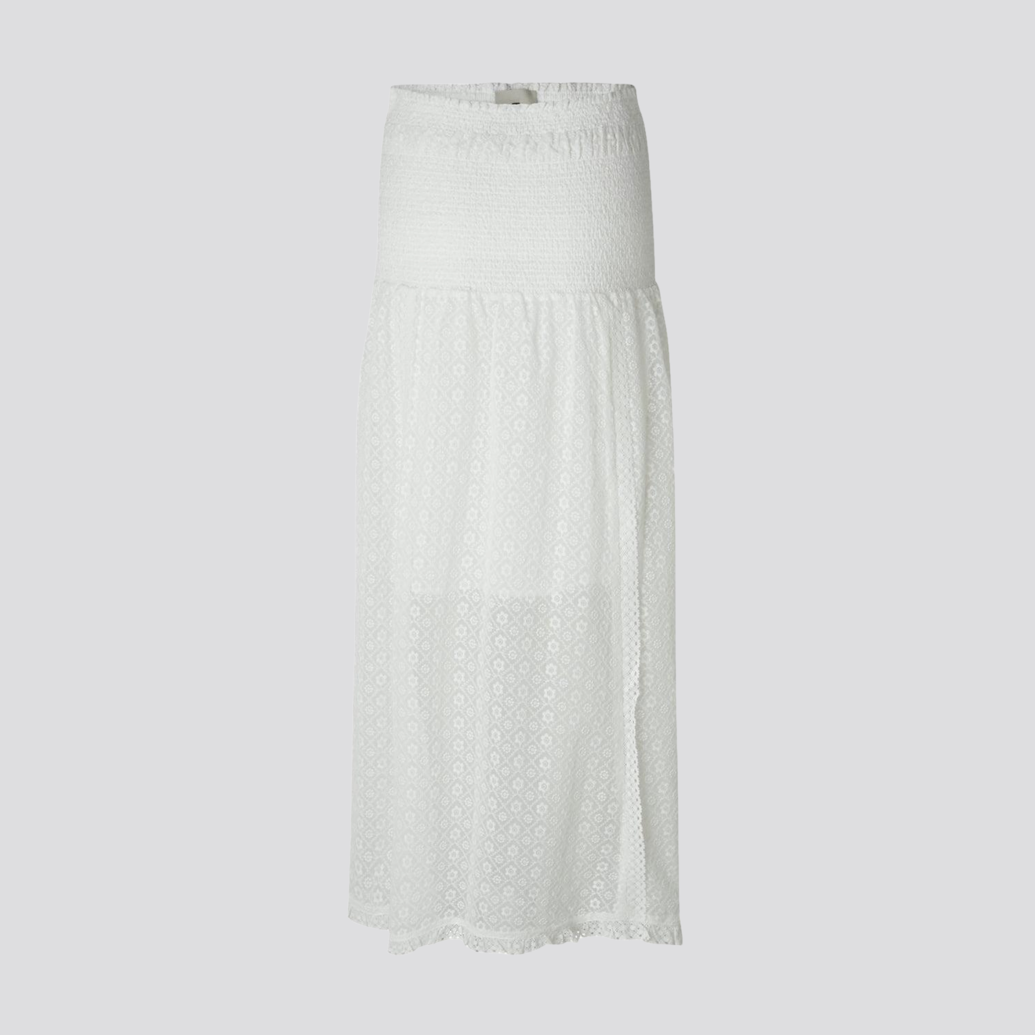 The Garment Rome smock dress is a beautiful cream-colored dress with floral stitching and an underskirt. It can be worn as a dress or as a skirt, and the size is normal (the model is 178cm and is wearing a size 8). The dress is made of 100% recycled polyester.