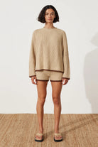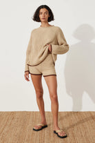 The Sand Contrast Rib Knit Short Zulu & Zephyr features a mid-high waisted fit, relaxed leg opening, and thick elasticated waistband in a soft touch knit fabrication. Pair with the Sand Contrast Rib Knit Jumper for a coordinated look.