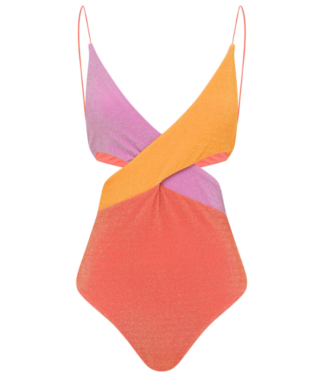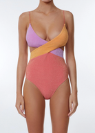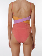 The Riot One Piece in Sunkissed is crafted in our metallic lurex fabric, featuring luminous contrasting pastel color blocks and figure-flattering cut-out sides