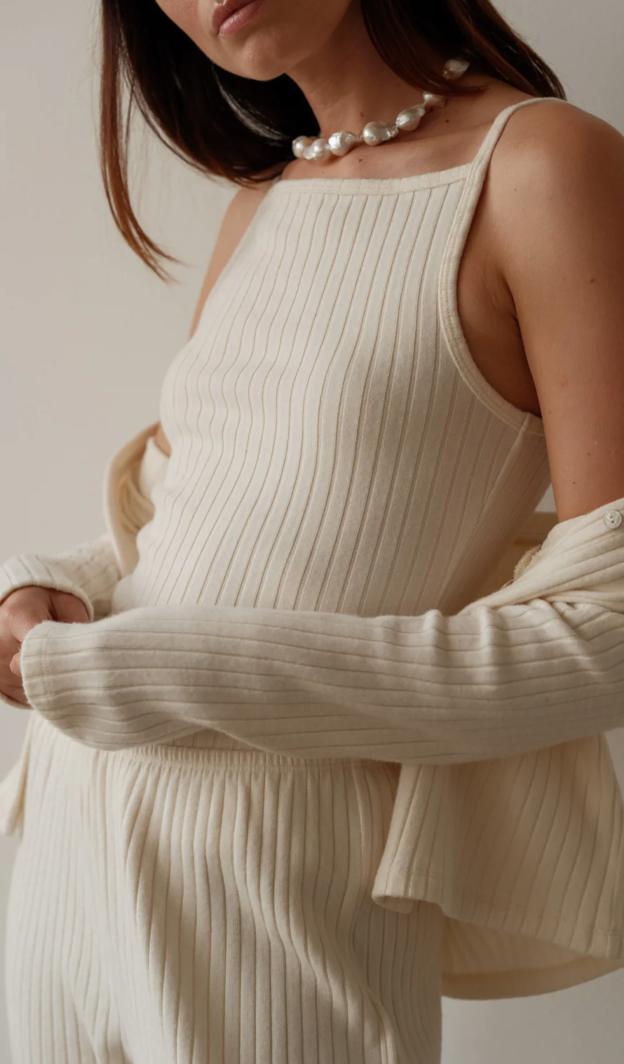 The Sweater Rib Tank is crafted from our super-soft sweater rib fabric, featuring a ribbed texture and square neckline.