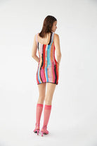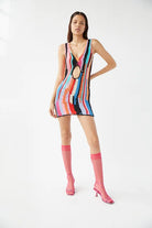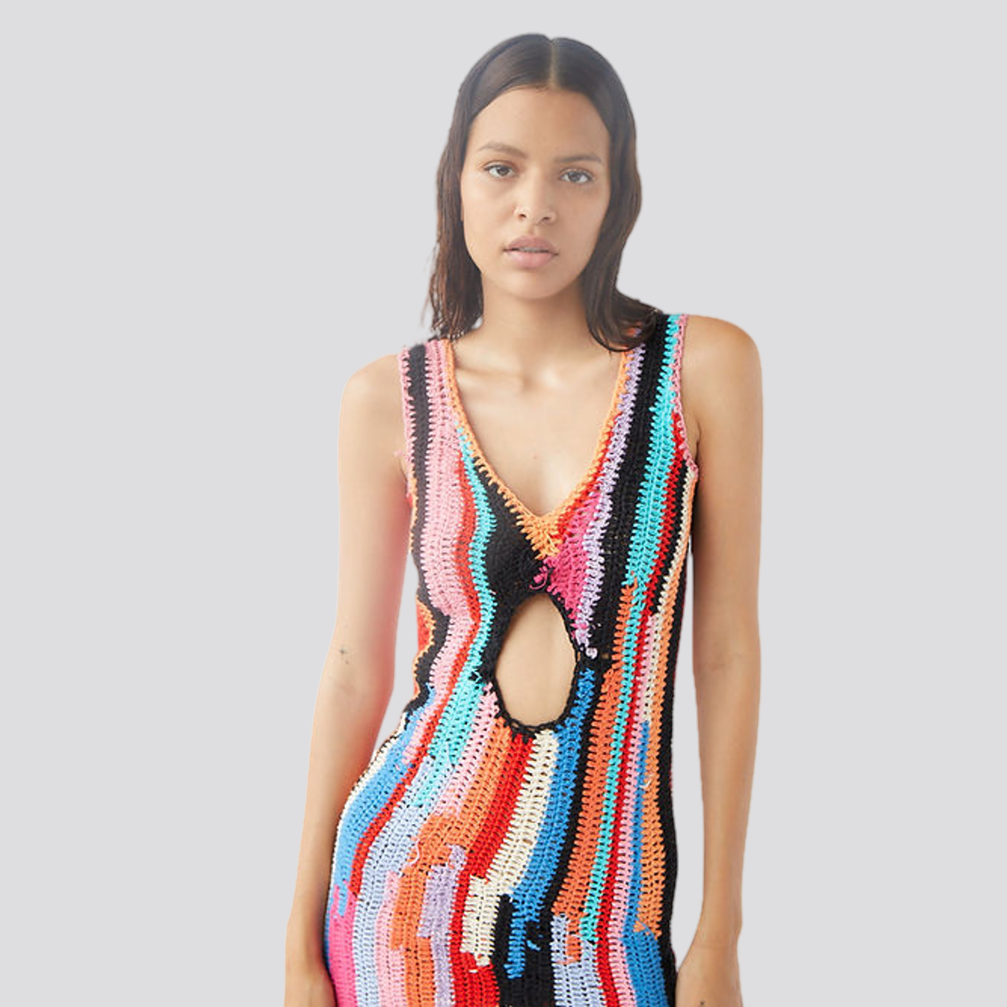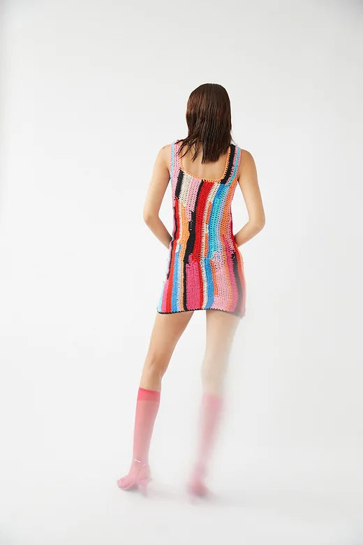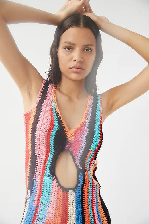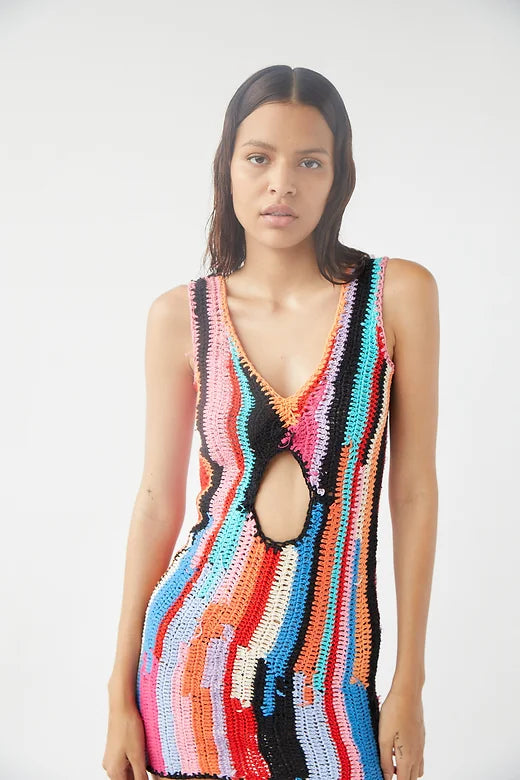 This handmade crochet dress is perfect for any occasion! The V front neckline and front cut out add a touch of sexy, while the square neckline at the back keeps it classy. The fitted silhouette is figure-flattering and shows off your assets. The Multi color is perfect for any skin tone and pops in any setting.