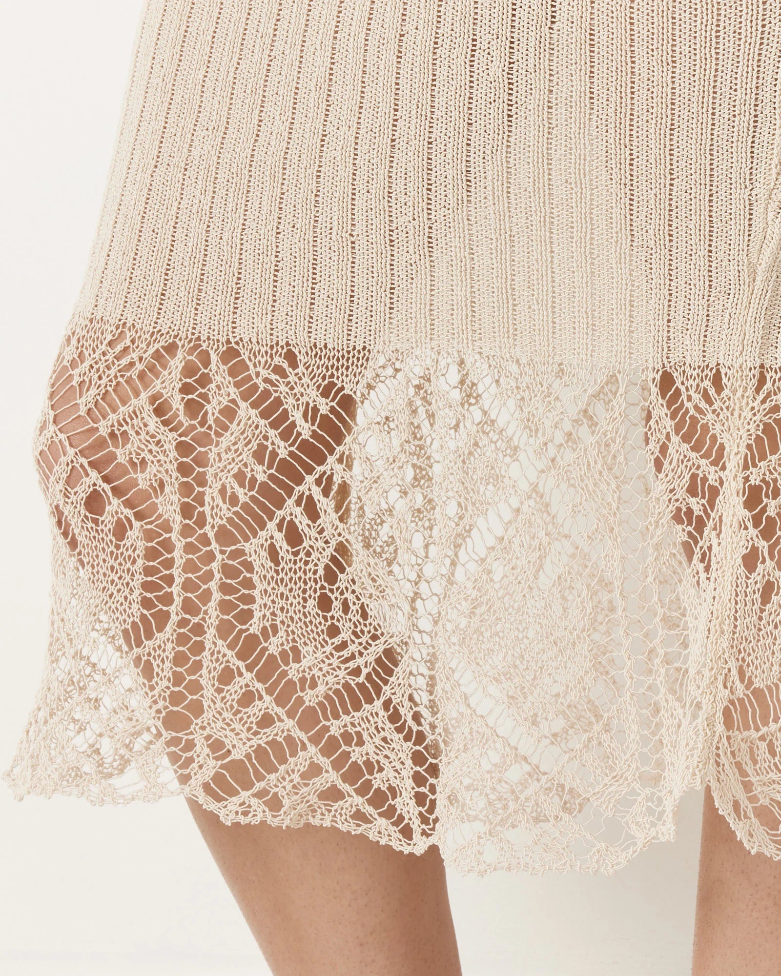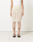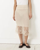 The Thin Cotton Lace Midi Skirt in Egret by Ganni is a cotton lace skirt featuring a ribbed fabrication and sheer panel trim.
