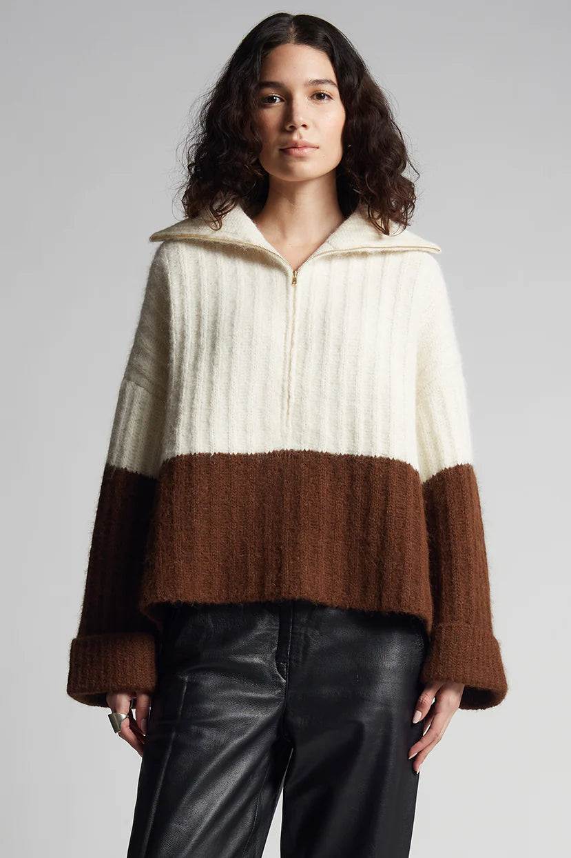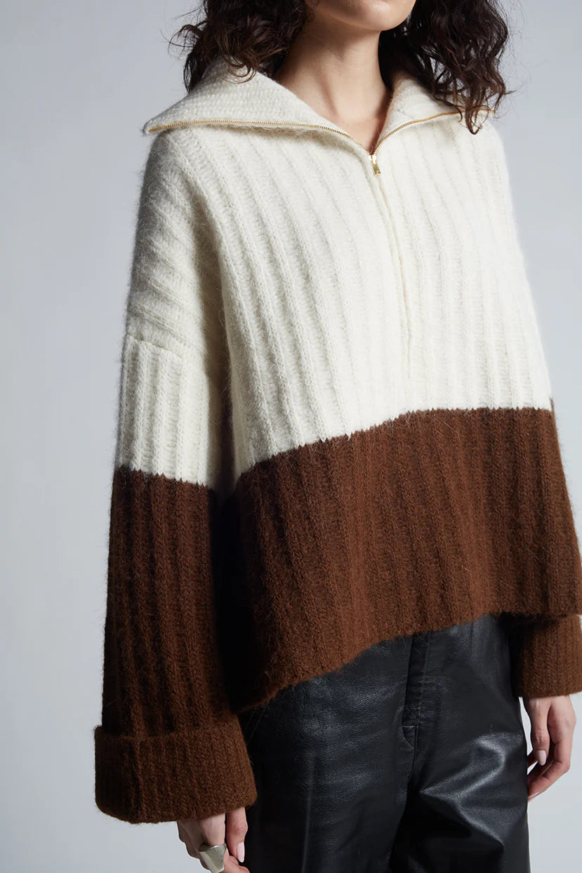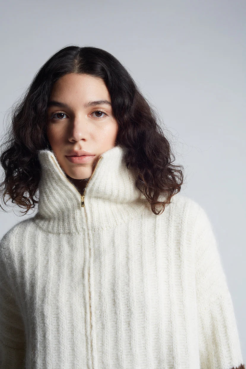Uma is a relaxed, color-blocked, poncho evokes that must-have-feel with its soft-volume, wide-deep-cuffed sleeves, half-zip funnel-neck and dramatic side-splits. Knit in the softest air-spun alpaca-yarn in a bold, rib-stitch that maintains fluidity, you might want to live-and-cocoon in this piece for rest of the season and timelessly thereafter.