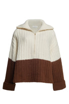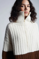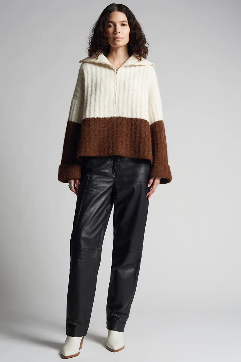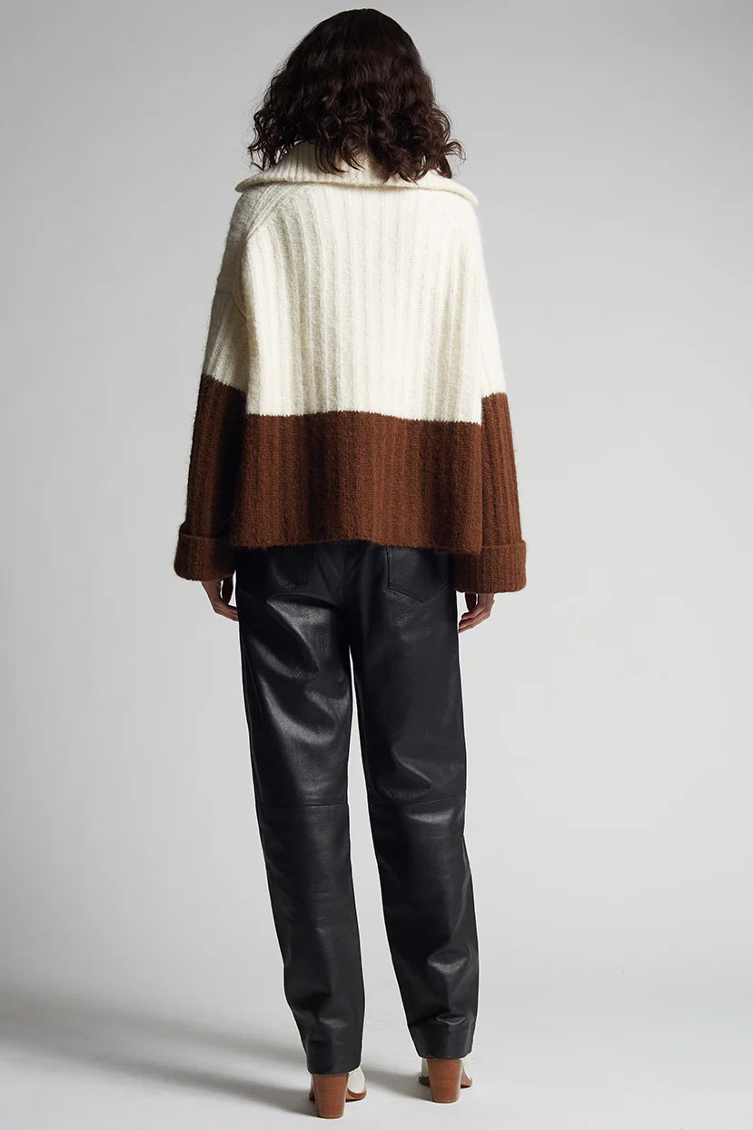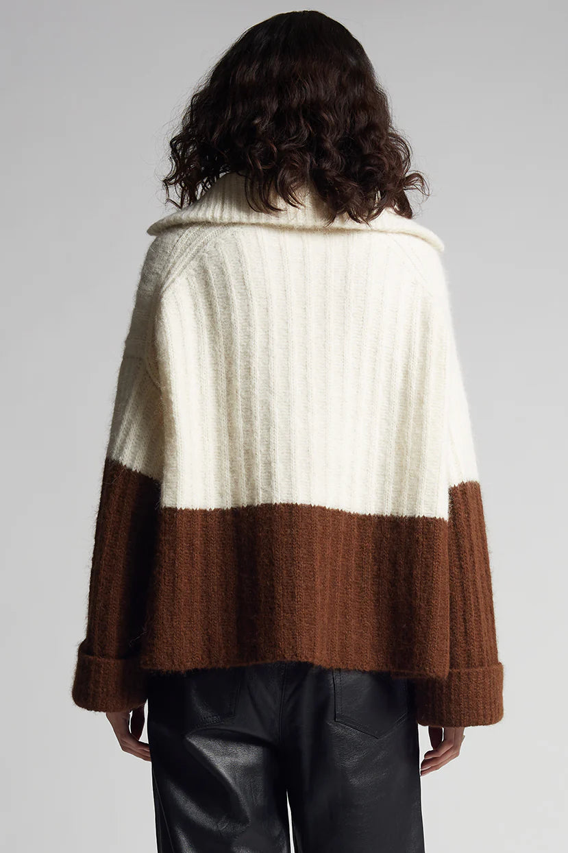 Uma is a relaxed, color-blocked, poncho evokes that must-have-feel with its soft-volume, wide-deep-cuffed sleeves, half-zip funnel-neck and dramatic side-splits. Knit in the softest air-spun alpaca-yarn in a bold, rib-stitch that maintains fluidity, you might want to live-and-cocoon in this piece for rest of the season and timelessly thereafter.