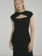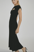 The Violeta Dress in black is a stretch velvet, bias cut midi-length dress featuring cap sleeves and a flattering cut out at the chest. Center back zipper closure.