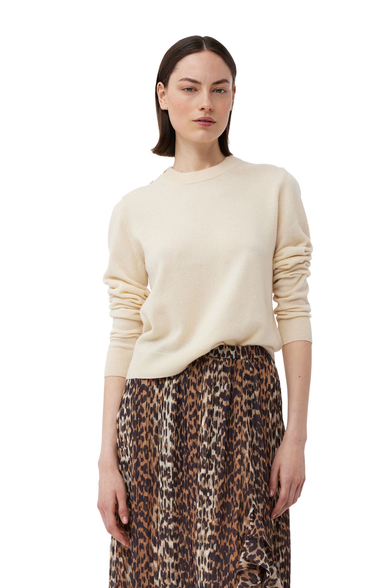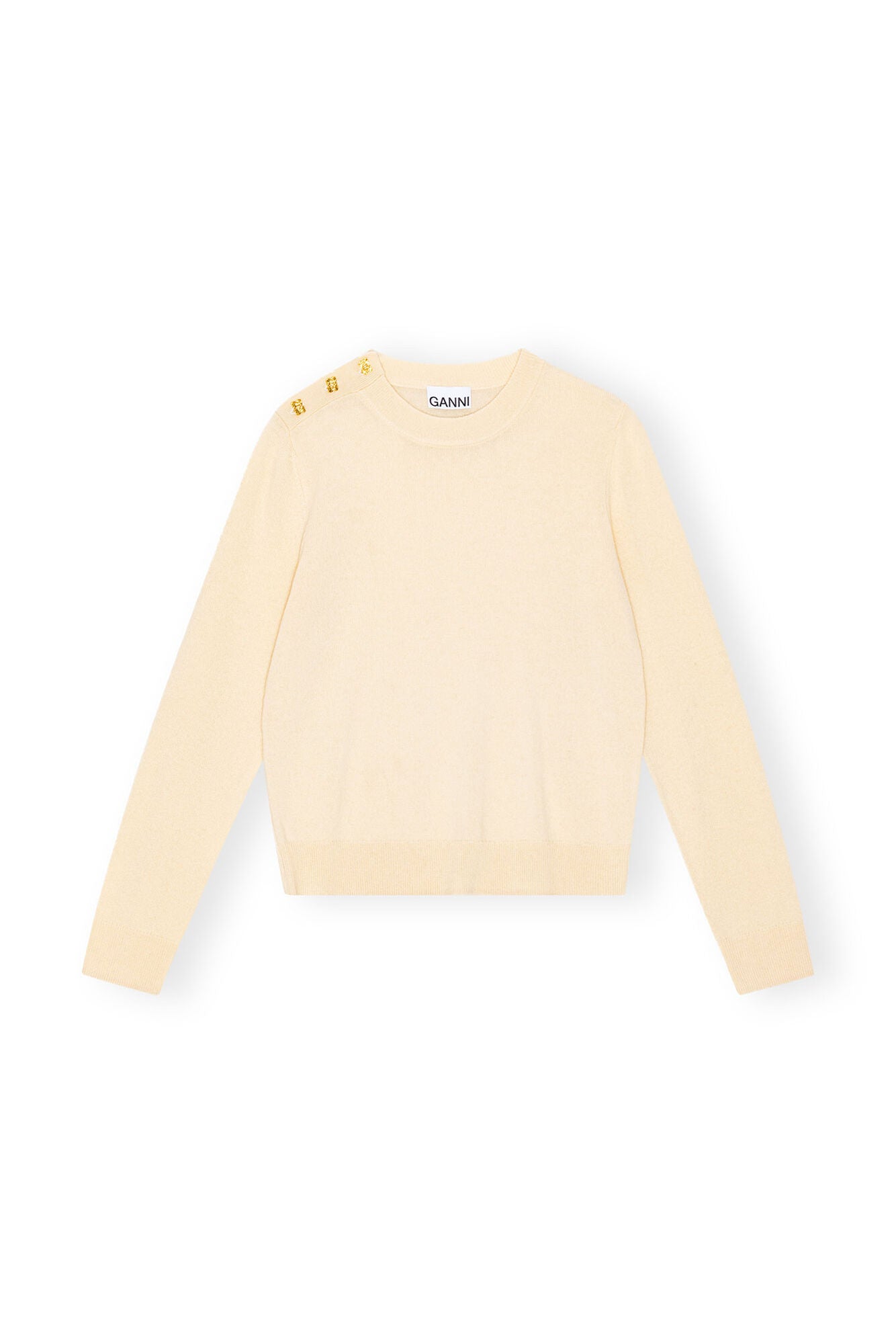This White Cashmere Mix O-Neck Pullover is made from merino wool and cashmere. The pullover is designed for a regular fit and features a round neckline, long sleeves, ribbed edges and GANNI Butterfly buttons on the shoulder.